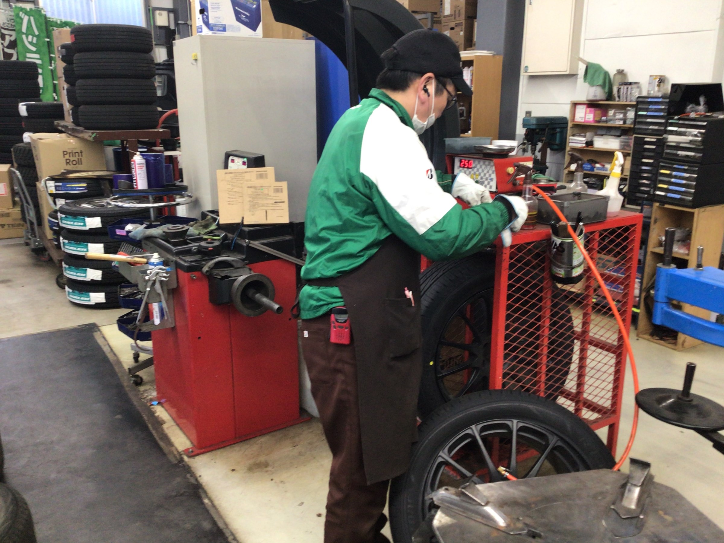 当店スタッフのトモヲ氏がお客様のタイヤを丁寧に組み上げております。