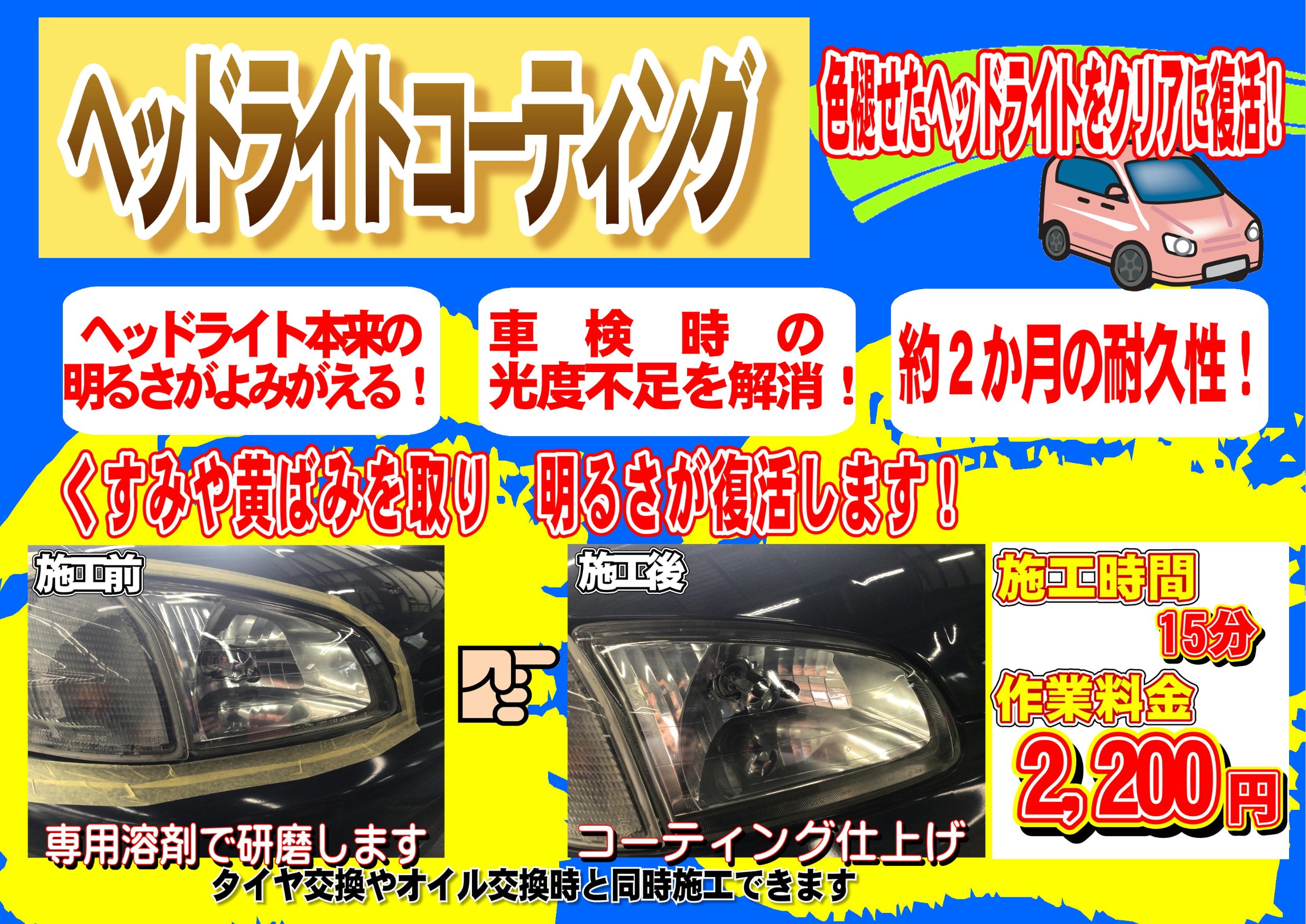 ヘッドライトコーティング ポスト 2021年7月14日 当店ではヘッドライトコーティング作業を受付しています。 車検時の光度不足解消や夜間の視界不良の改善などが見込めます。 施工時間も約15分で終わります。 ヘッドライトのくすみが気になるお客様は一度ご利用下さい。 担当:トモヲ