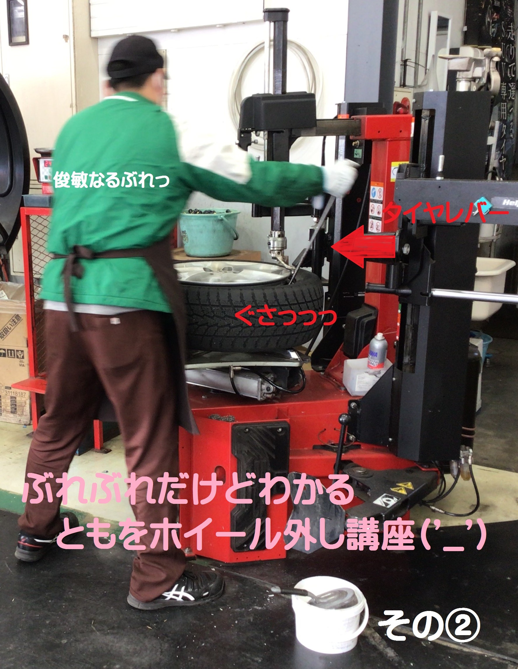 なにやら上に移動して、タイヤレバーをぐさっ!!