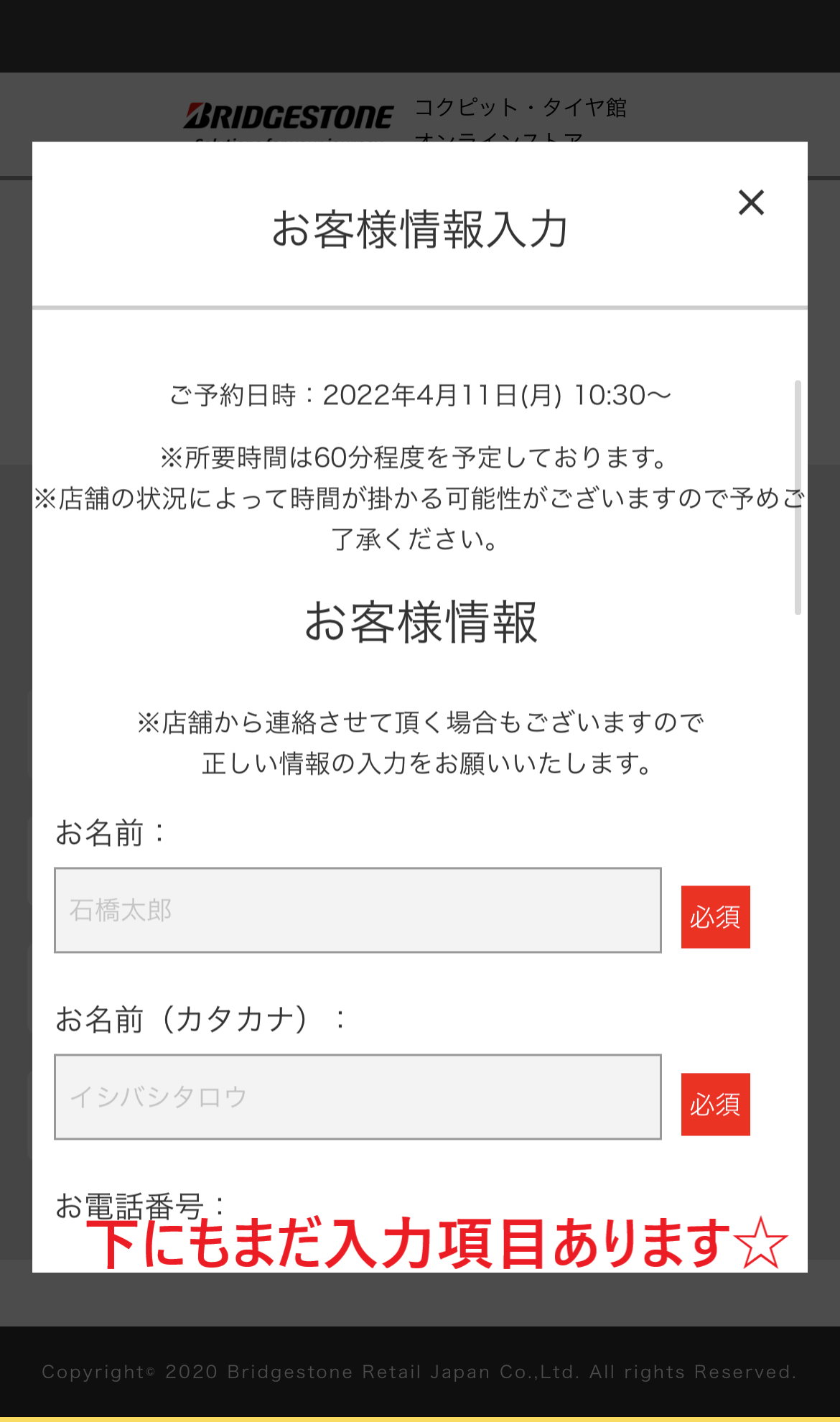 お客様のお名前・電話番号・お車情報・伝達事項を入力し、