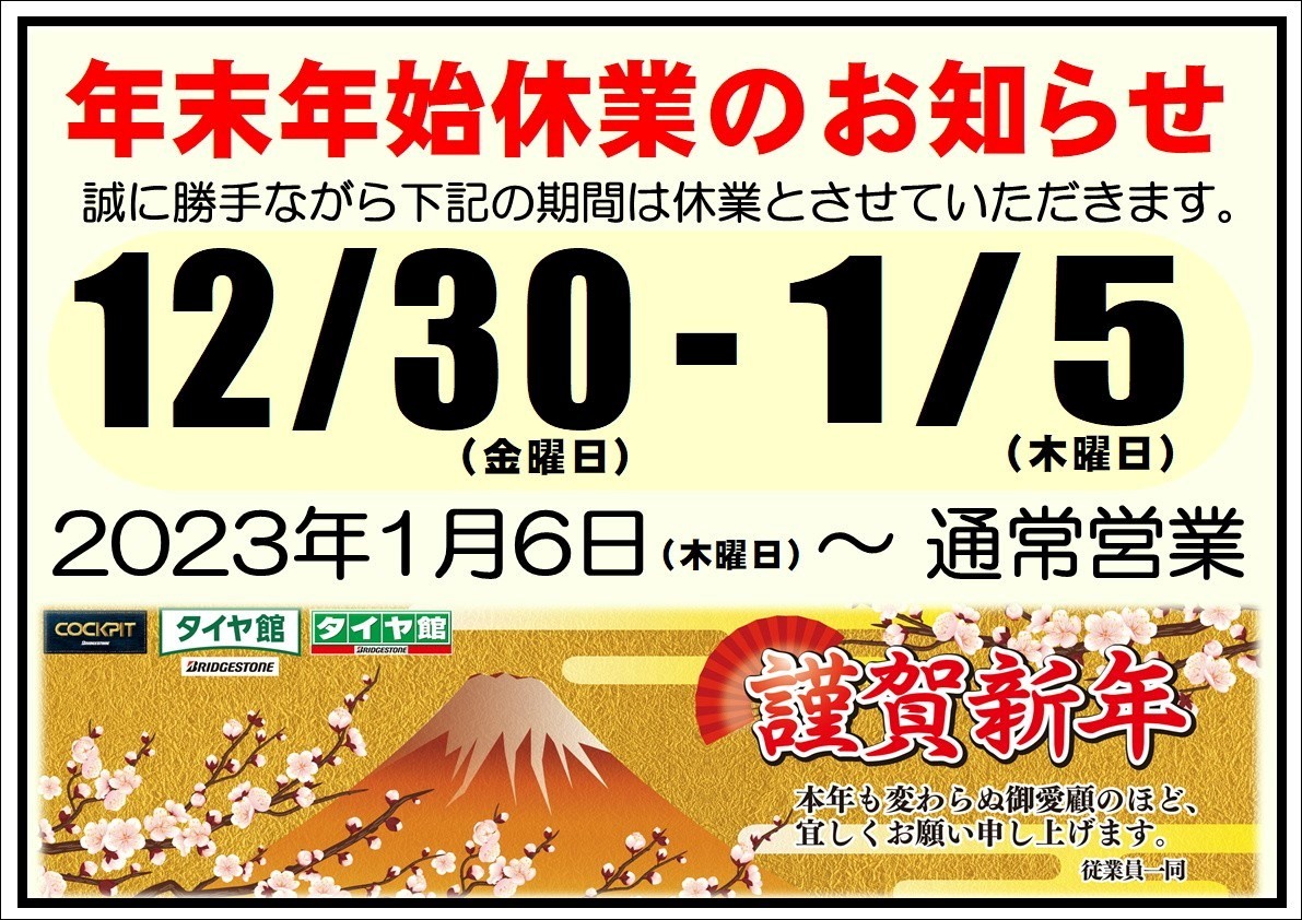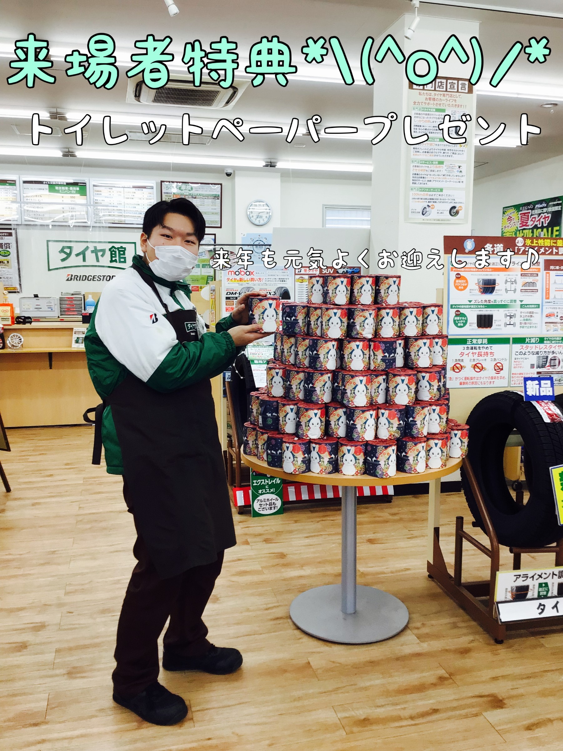 新春セール準備中! ポスト 2022年12月28日 1月6日より新春セール開催します!! ただいま新春セールの目玉商品を選抜してますので乞うご期待 来場者特典でトイレットペーパープレゼントしてますので タイヤの空気圧点検など気軽にお越しください!! ↓年末年始のお知らせです↓ 担当:高田