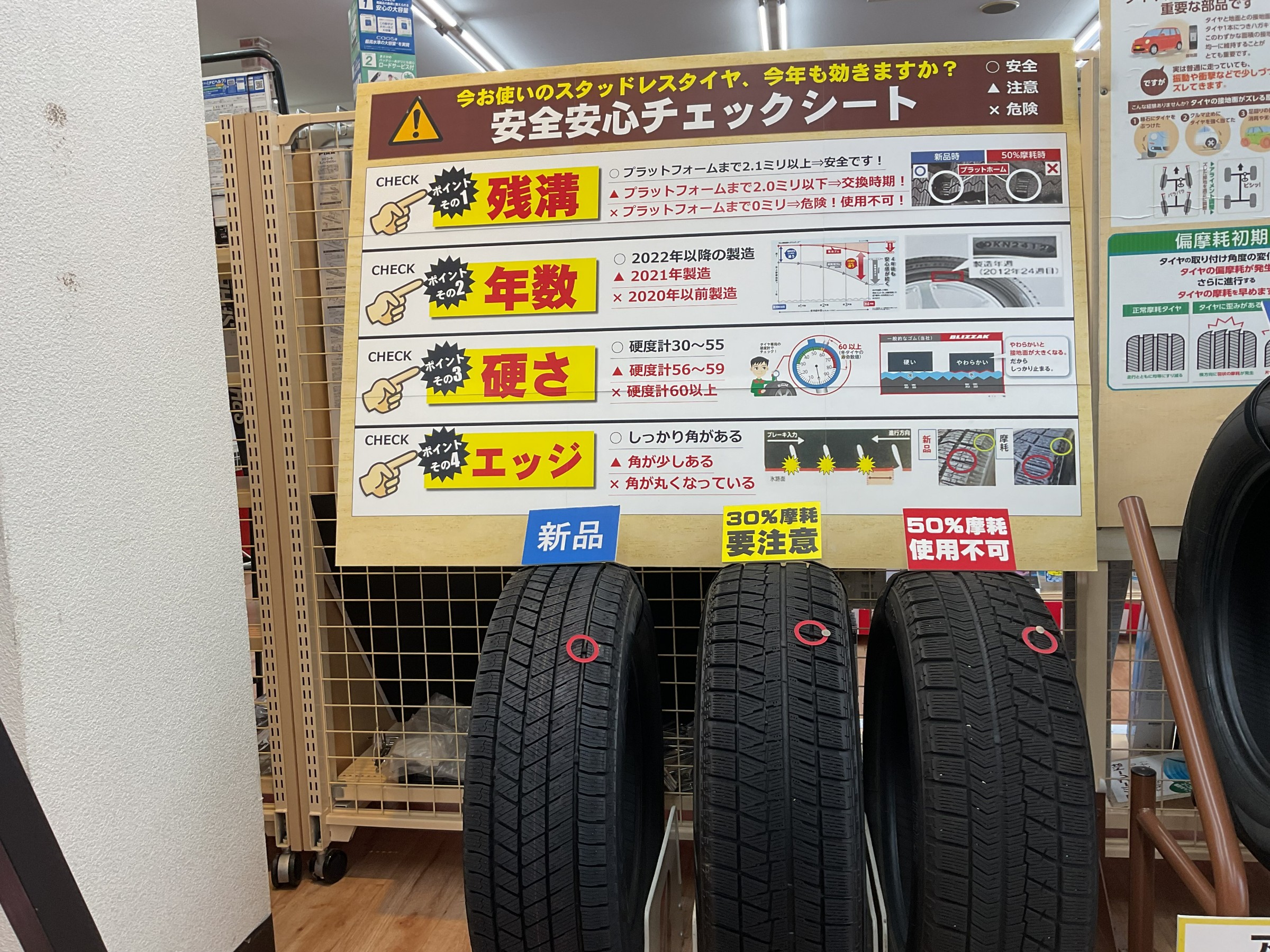 みなさまに安全・安心にタイヤを使っていただくために当店では無料でタイヤ点検を行っています!