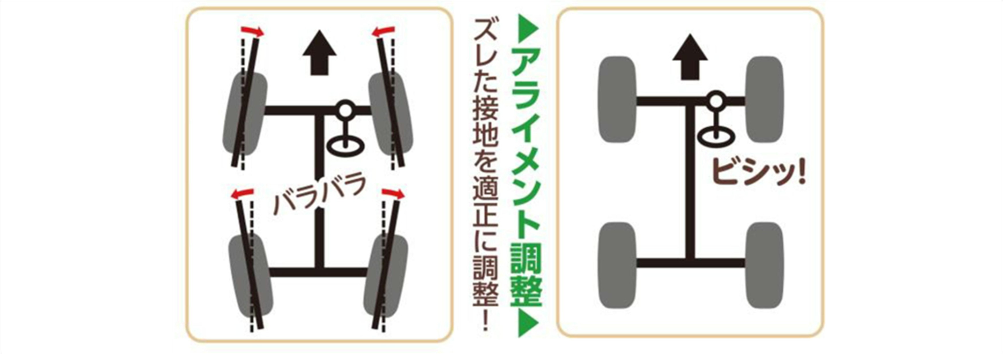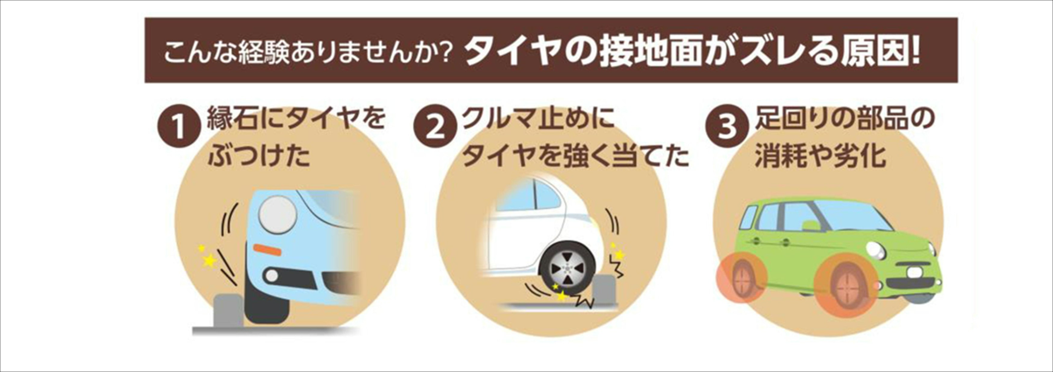 上記のようなよくあるシーンでタイヤのアライメントはズレていきます。