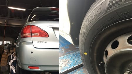 一枚目の写真(左)は昨日タイヤをご購入いただいたお客様がアライメント調整をしていただい