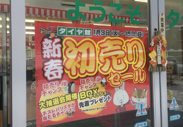 初売り 好評開催中です☆ ポスト 2017年1月5日 こんにちは。 こばやしです。 お正月明けのお祭り、初売りセールは好評開催中です~☆ 期間は15日迄やっています☆タイヤもアライメントもバッテリーもお正月価格でご提供しています☆ 天気は少し荒れ気味ですが、お車の大事なメンテナンスは待ったなしです! 荒れてつるつるガタガタのこの道路、なんか心配になりますよね! 是非お気軽にご相談ください! 担当:小林 爵人
