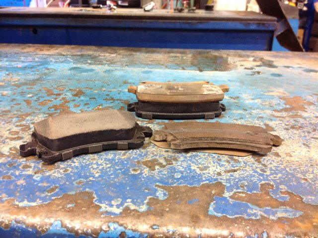 写真は交換の様子と新品のブレーキパッドと今までついていたパッドの写真です。