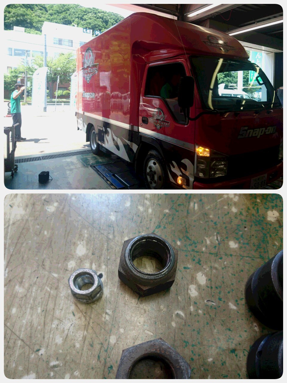 見てください!トラックのナッと、普通乗用車のナット!こんなにも大きさが違うんですね☆