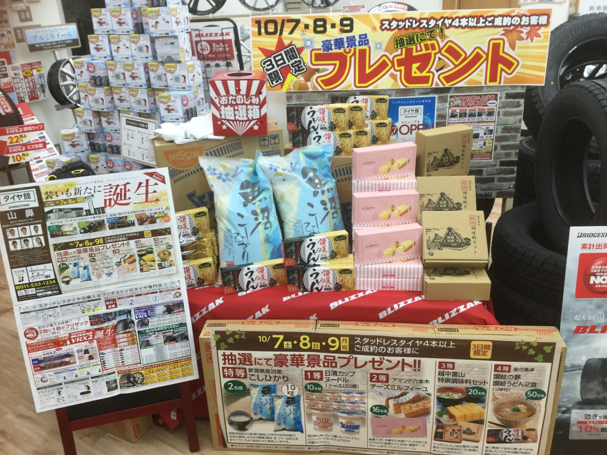 お待たせいたしました!!! ポスト 2017年10月6日 こんばんは! 皆様お待たせいたしました!!! ついに明日土曜日から月曜日(祝)までリニューアルオープンセール開催します!!!!! タイヤご成約のお客様には抽選ですが、景品もご用意しております!!! 景品は無くなり次第終了とさせていただきます。 この機会に是非おこしください!お待ちしております。 担当:高橋
