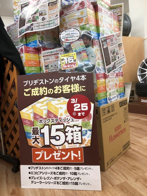 ☆集中得市まであと1日☆ ポスト 2018年3月16日 みなさん。こんばんは☆ 3月17日(土)から始まる集中得市!! 夏タイヤのご予約!スタッドレスタイヤの在庫処分、お買い得価格でご提供します!! 期間中、タイヤご購入特典として・・・ ボックスティッシュをプレゼントいたします!! 購入された商品によって『最大15箱』プレゼント!!☆ 期間中、スタッフ一同心よりお待ちしております☆ 担当:小林 爵人