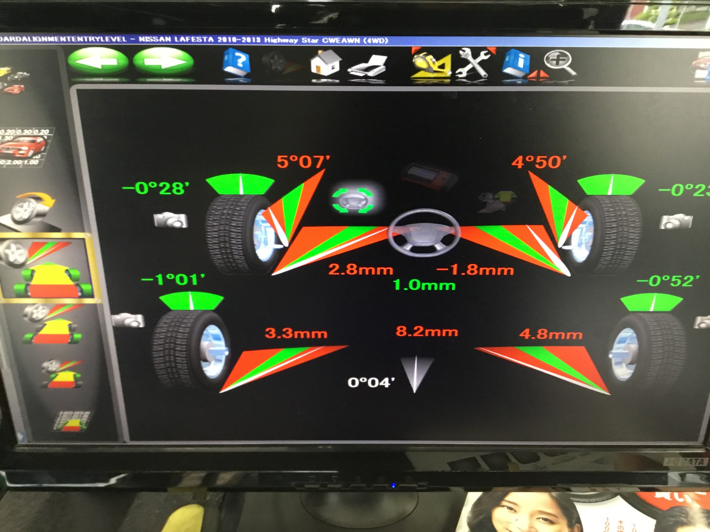 今日はラフェスターのタイヤご購入&アライメント&空気圧センサーTPMSのお取付。