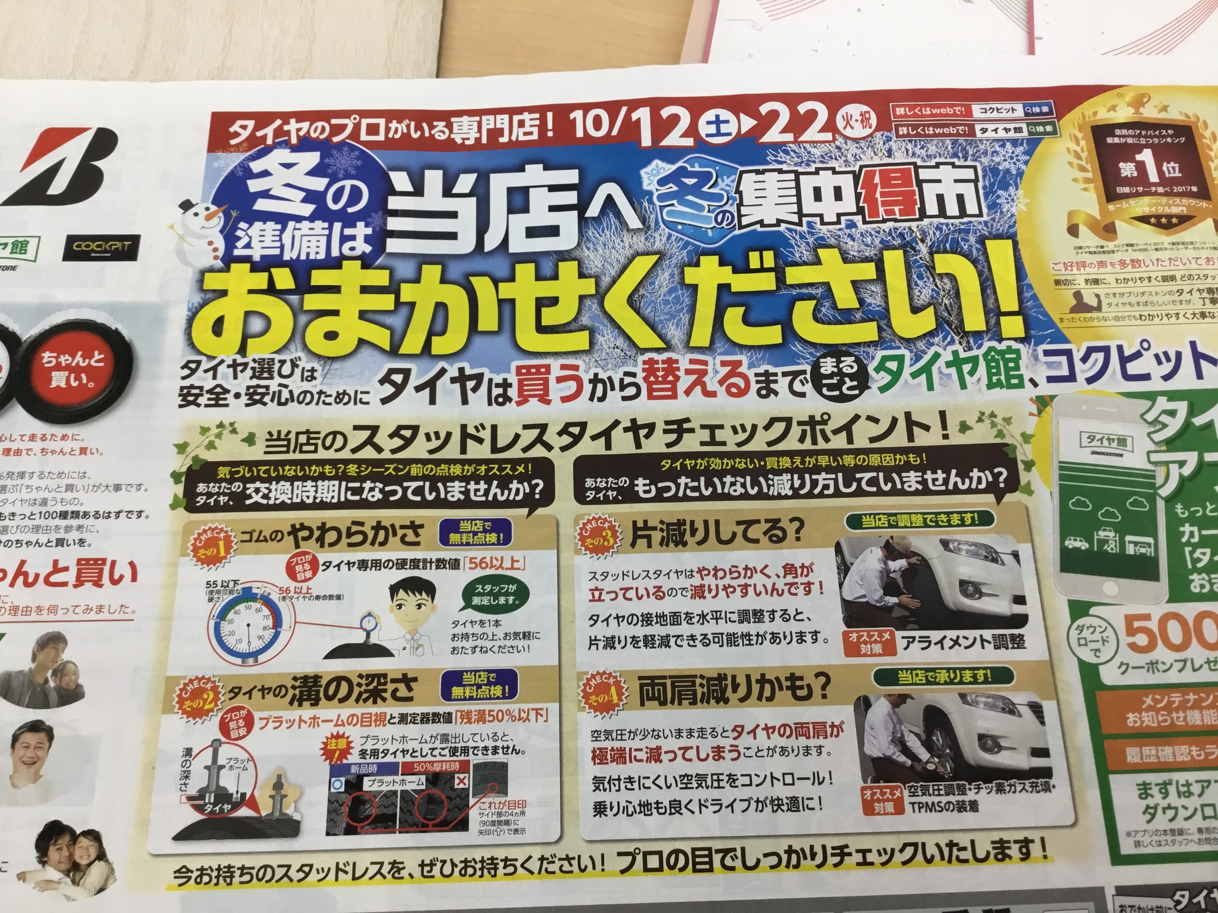 売り出しです ポスト 2019年10月12日 こんにちばんは タイヤ館山鼻 片山です。 今週も! 売り出し中! ハッピ着ながらタイヤ交換しています 空模様も怪しくなってきました。台風が近づいてきているのでしょうか 峠も雪が降りそうなので、遠出される方はお気を付け下さい では! 担当:片山