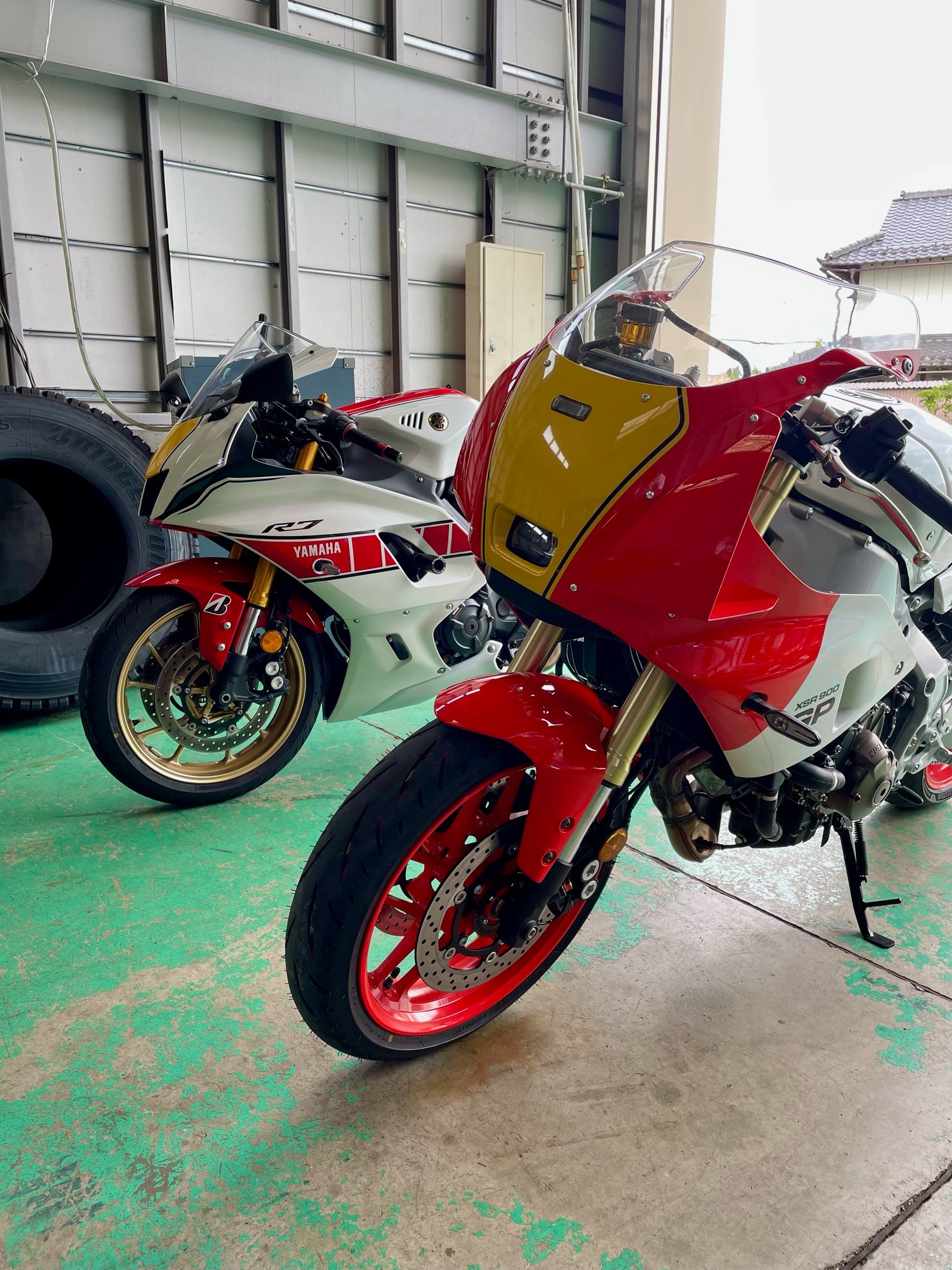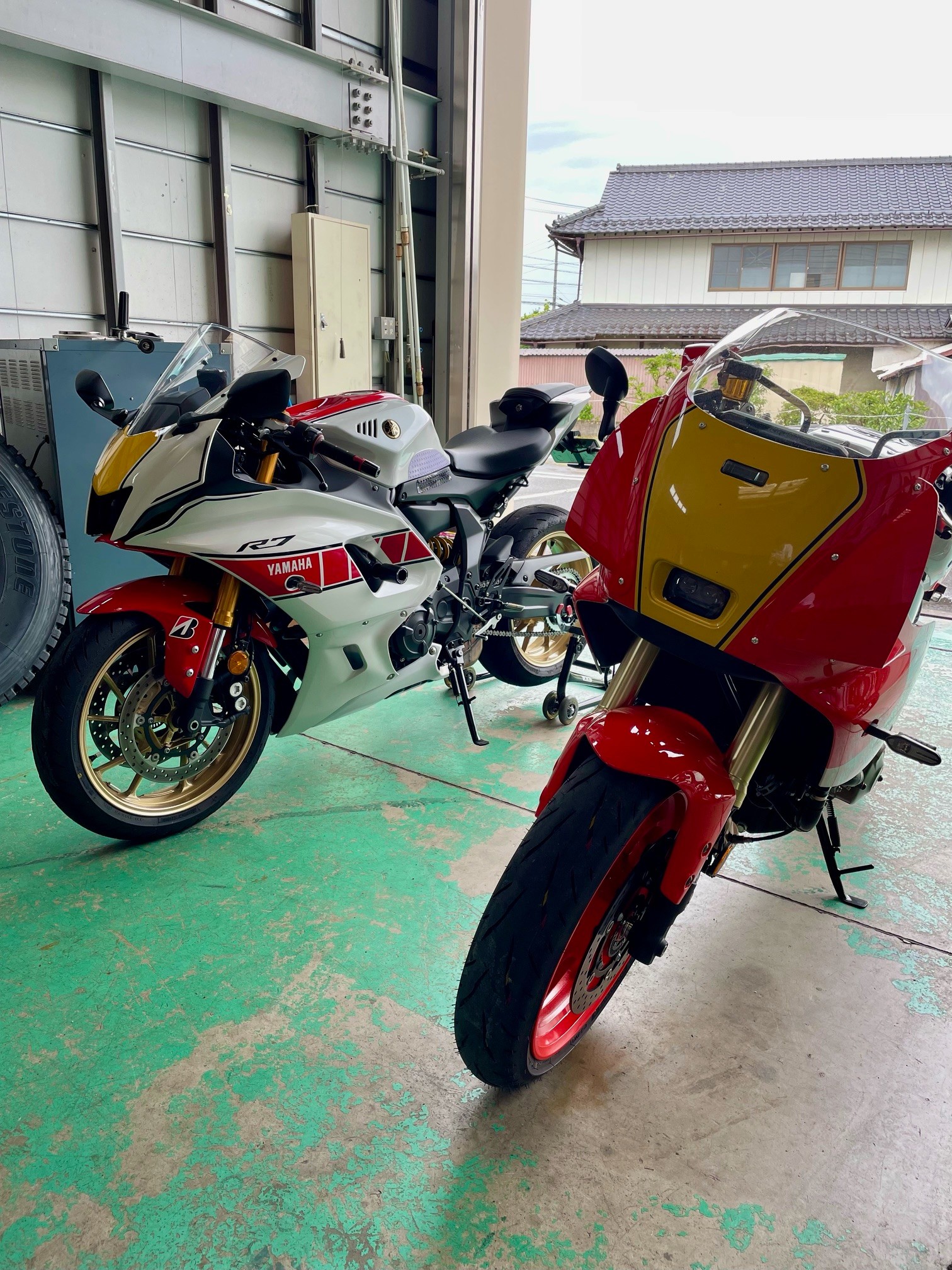 似たようなカラーリングのバイクが2台並んでいますが、