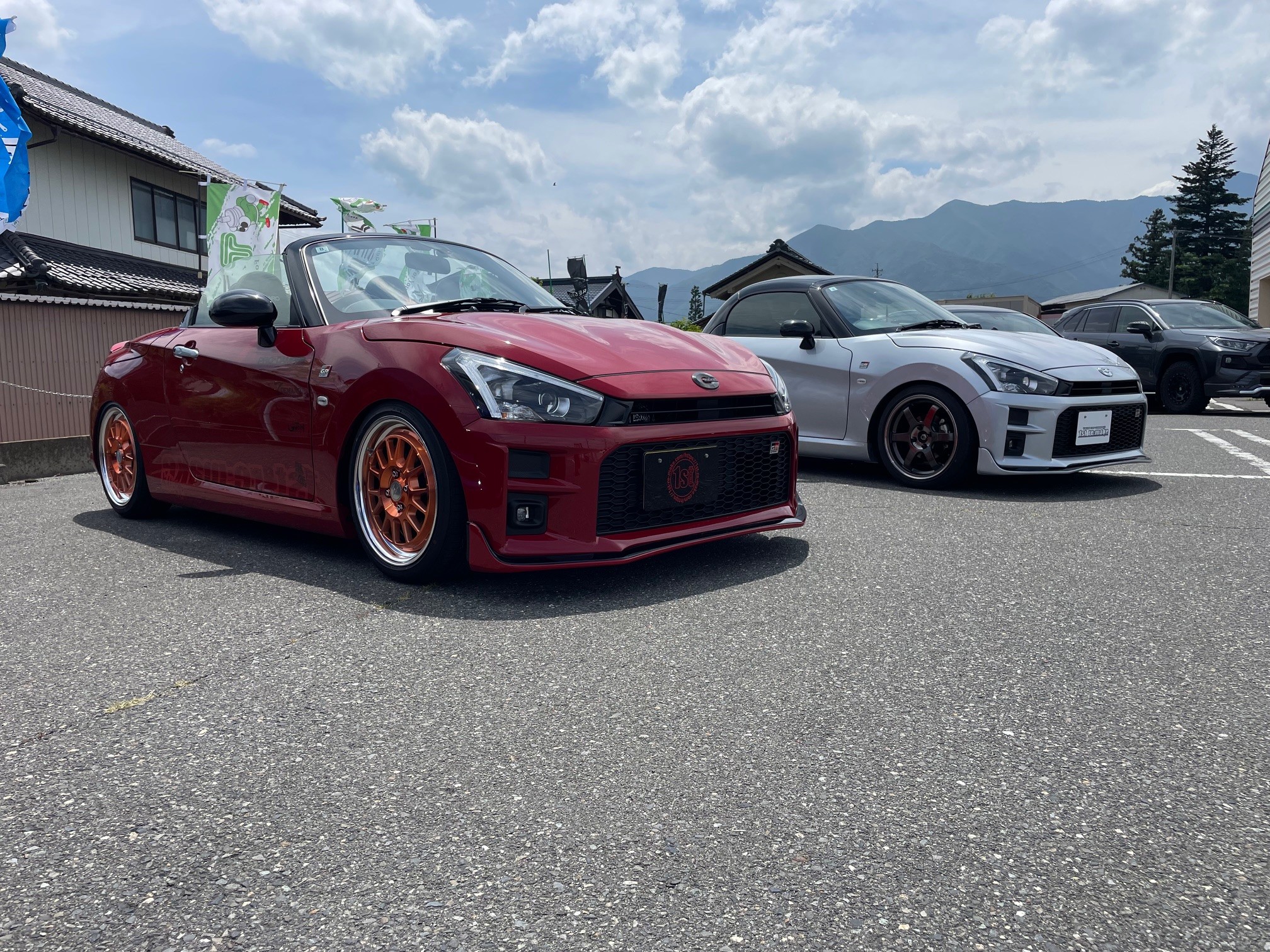 赤い方はエアサス装着済みの超車高短仕様でリヤフェンダーが被ってしまってます(笑)