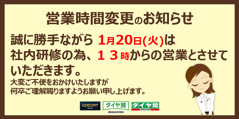 皆様、こんにちは(^^)/ 営業時間変更のお知らせです。 1月20日(火)は、社内研修の為13時からの営業となります。 ご利用のお客様におかれましては、ご迷惑おかけいたしますが、 何卒ご理解ご了承の程お願い申し上げます。