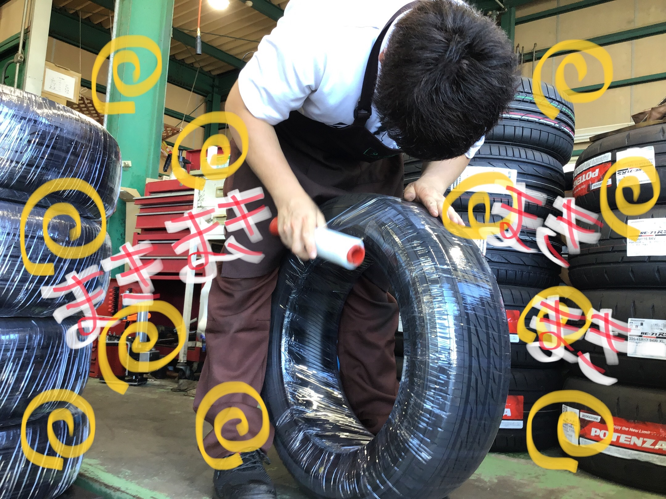 中川さんがタイヤにラップを巻いています。