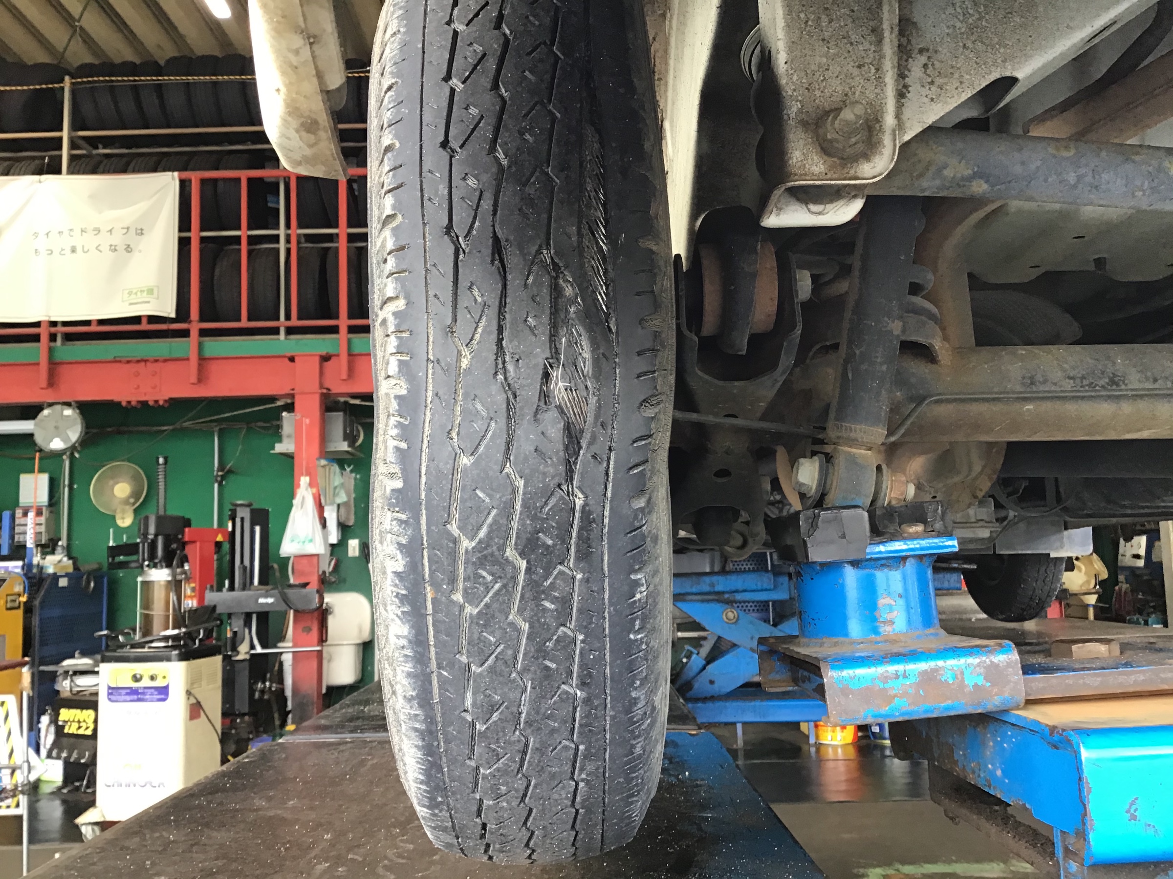 今回の作業はタイヤ交換だったのですがピットにお車を入れてリフトアップして見てビックリ!タイヤが破裂寸前じゃないですか!これはセパレーションというもので空気圧不足とうから起こる要因の一つなんです(><)すぐに新しいタイヤと交換させていただきました。みなさんもタイヤの空気圧管理はしっかりとしてくださいねo(^_-)O