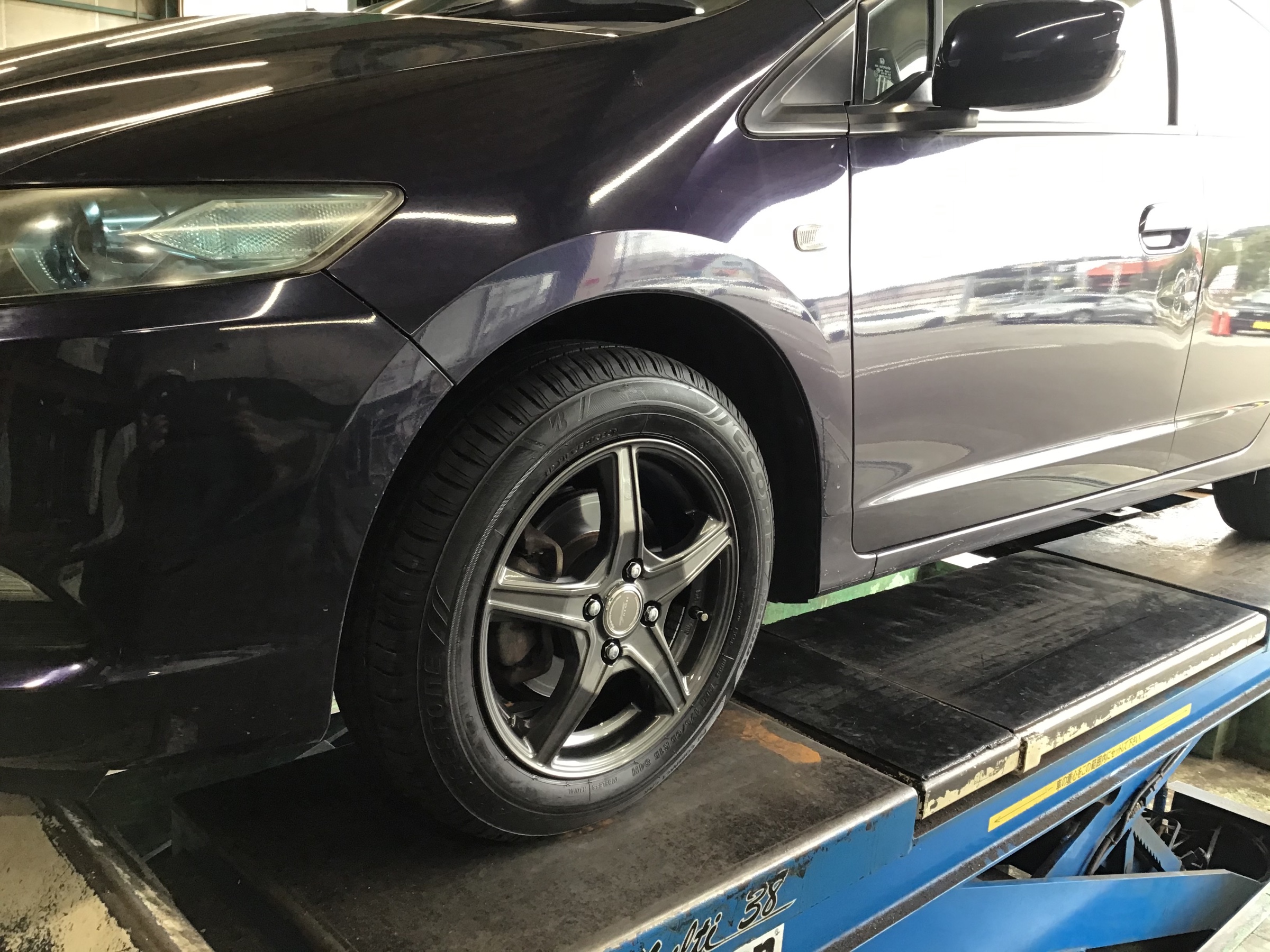 本日はホンダインサイトでご来店のお客様のアルミホイールを交換いたしました(・∀・)店頭に飾ってあったアルミホイールを見て気に入られたようで即作業をさせていただきました(*'ω'*)作業後のお客様はとても満足そうでした♪( ´▽`)