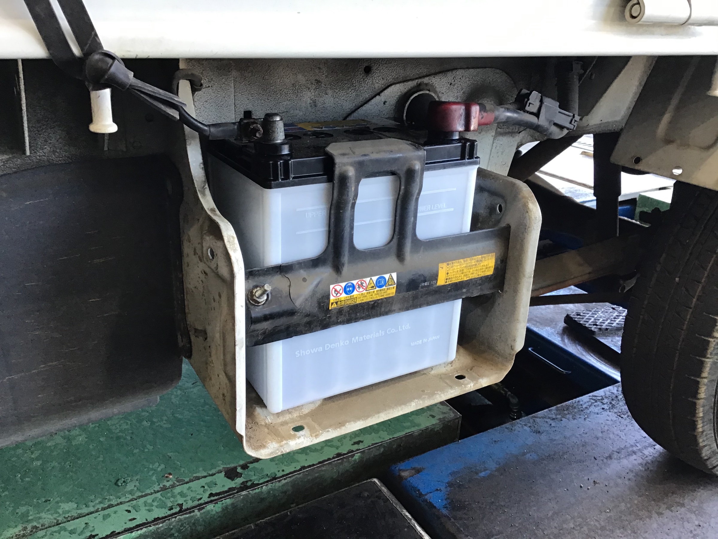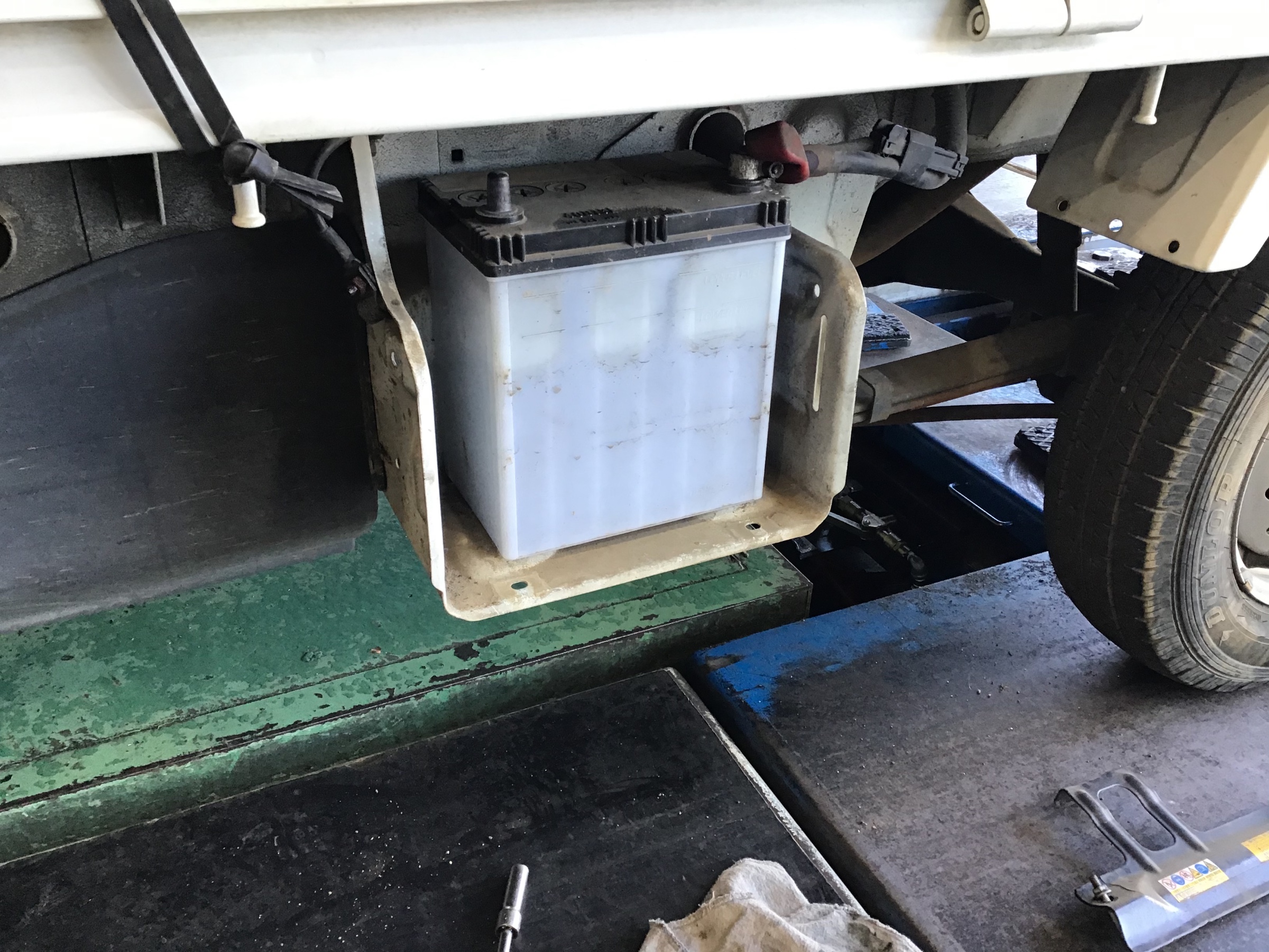 本日の作業はスズキキャリーのバッテリー交換です♪(´ε` )エンジンのかかりが弱く感じているとのことで電圧を計測してみたところ、やはり弱かったのでお客様にお伝えしたところバッテリー交換となりました( ◠‿◠ )