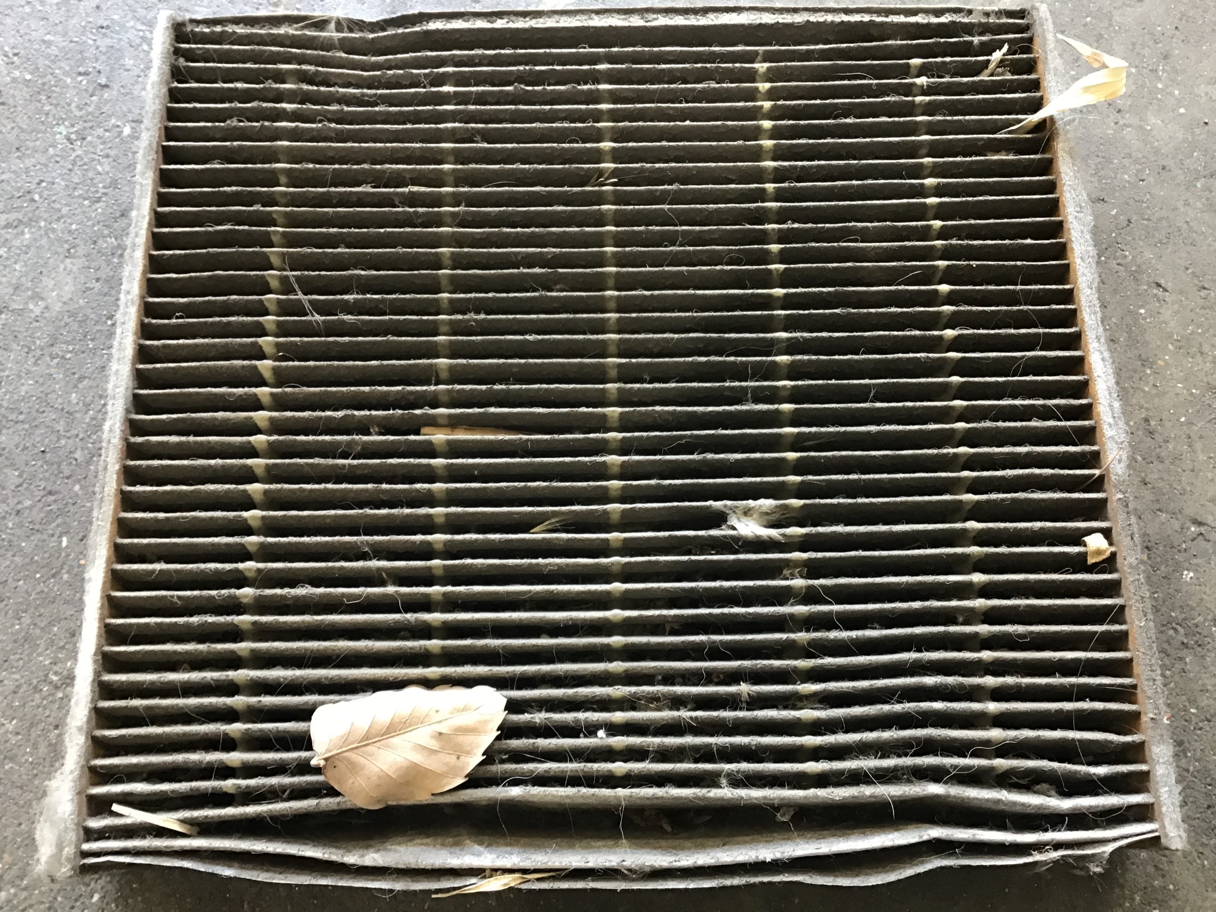 外してみて枯葉や埃がこんなにたくさん付いていたのでお客様に報告したところ即交換して欲しいとのことでしたので、新しいフィルターに交換させていただきお客様も一安心されていました(≧∇≦)