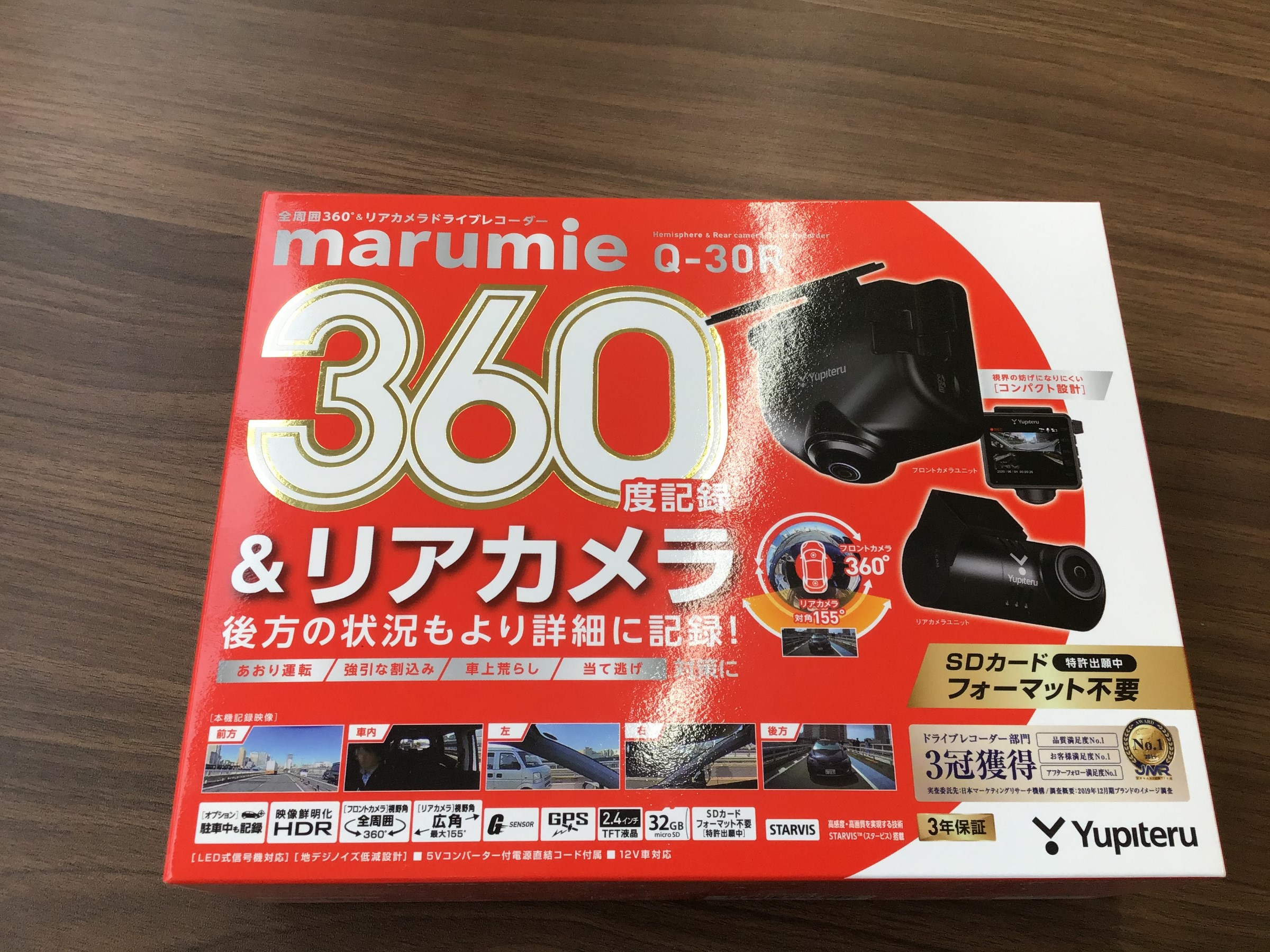 ユピテル「Qー30R」というドライブレコーダーなのですが、こちらは360度全周記録+リアカメラが付いていますので前方や後方はもちろん車内や左右の状況まで詳細に記録してくれるスグレモノなんですっ(*'ω'*)