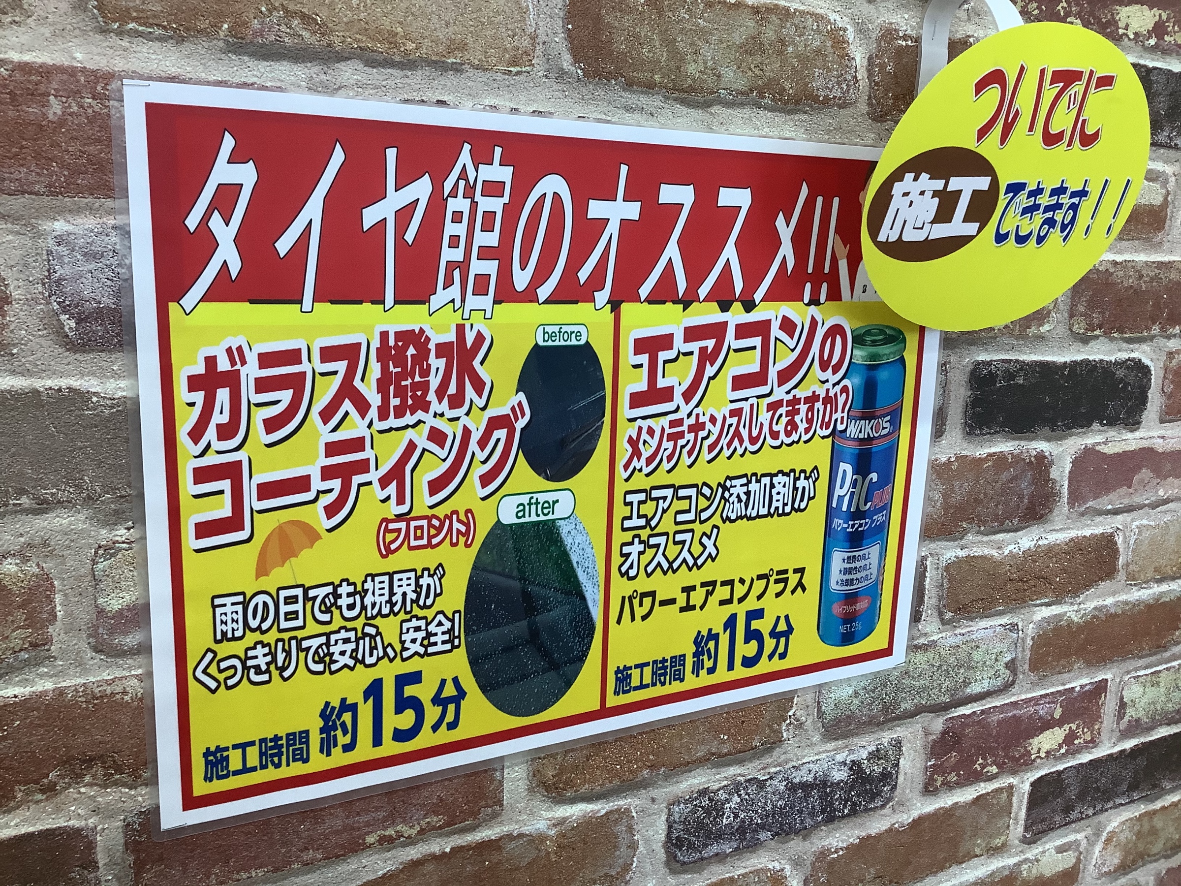 当店では先月に引き続き、ガラス撥水コーティングと「エアコン添加剤」をオススメしてます!