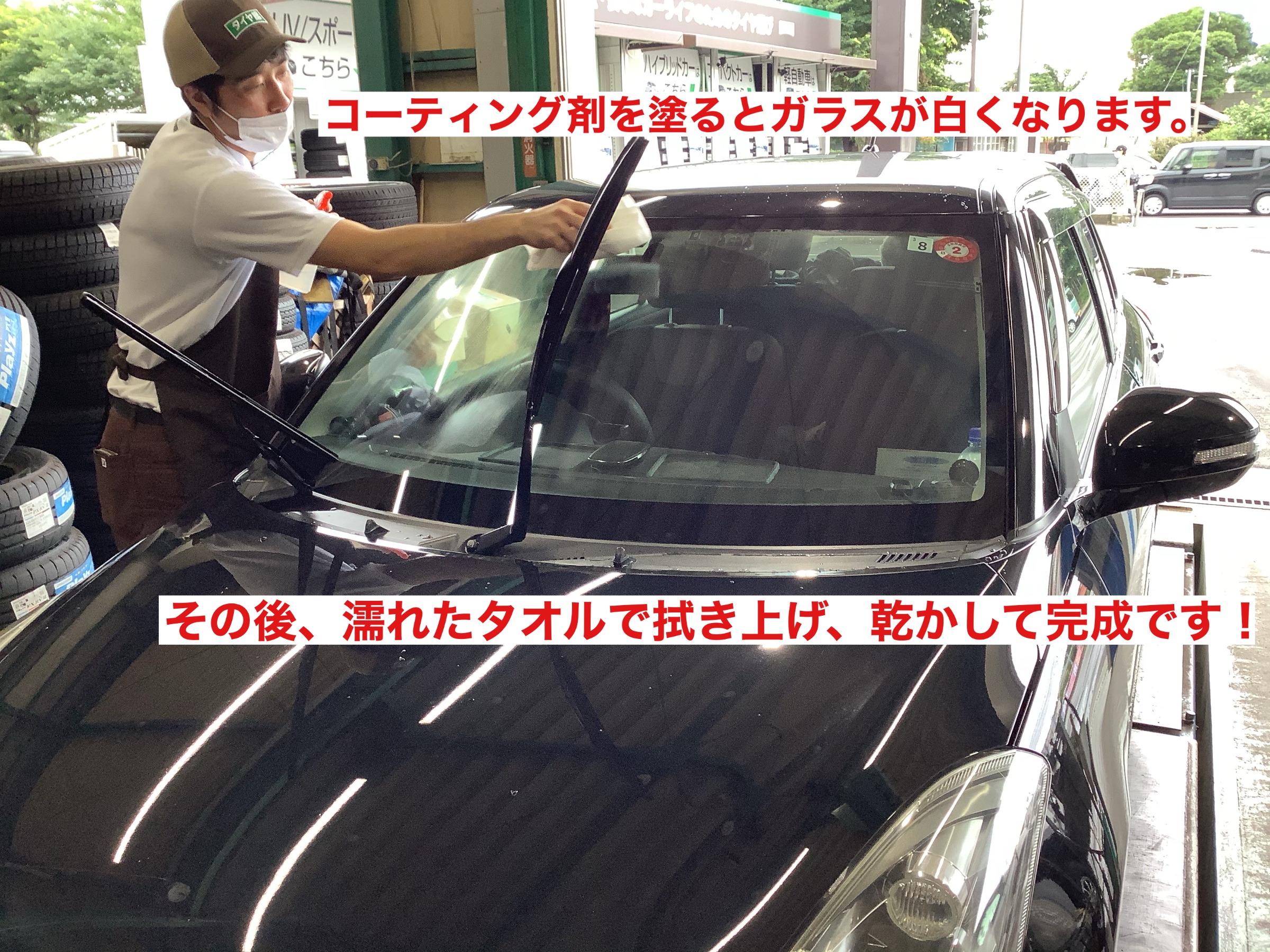 フロントガラスの油膜を落とした後、撥水皮膜を形成するコーティング剤を塗布し、