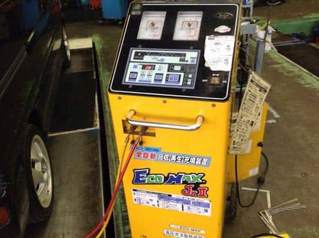 エアコンガスクリー二ングで冷え復活。当店では車内のガスを回収して真空引き後