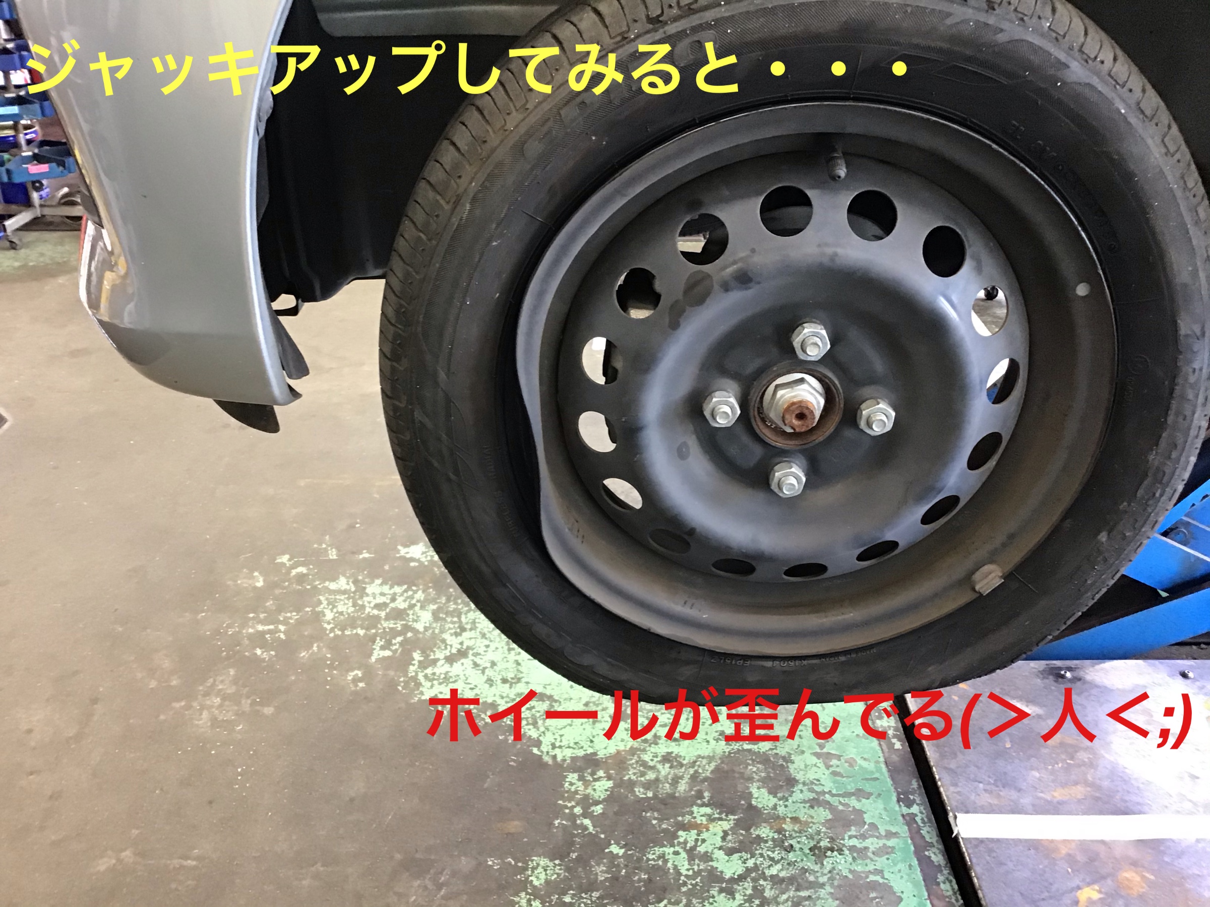 ピットに入れ、お車をジャッキアップしてみるとスチールホイールが歪んでしまっています。