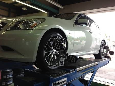 本日のスカイラインのタイヤ交換後にアライメント調整を行いました。