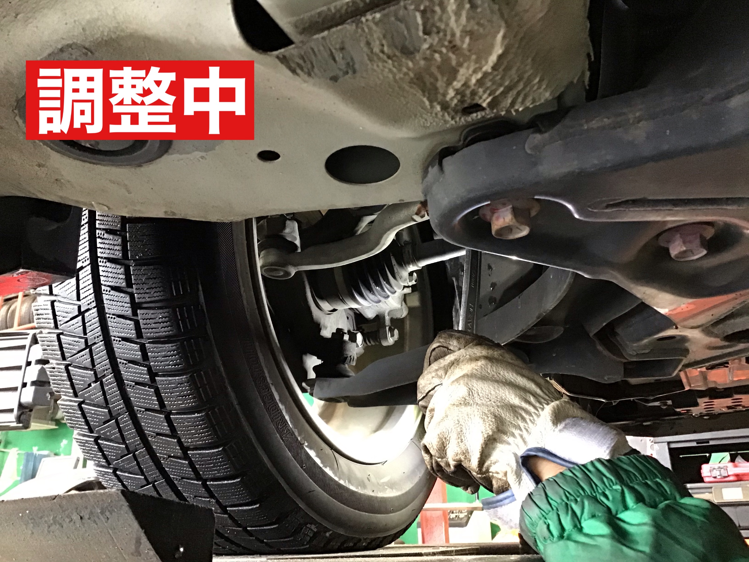 お車をリフトアップし、下回りのアームを動かして調整を行います。