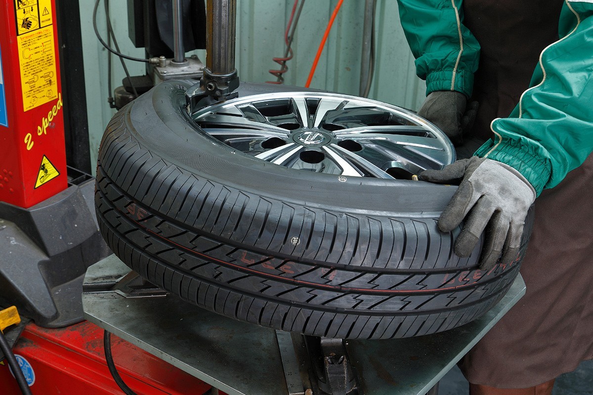 まずタイヤ・ホイールを外したら、ホイール、ホイールナット(ホイールボルト)等に損傷がないかどうか確認します。続いてタイヤチェンジャーを使ってホイールからタイヤを外し、新しいタイヤを組み付ける準備をします。