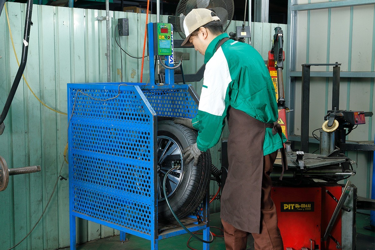 安全を確保するためケージの中で空気を充填します。タイヤ内圧の自然低下が少なくなり、より長く安定した状態に保つことができる窒素ガスの充填もおすすめしています。