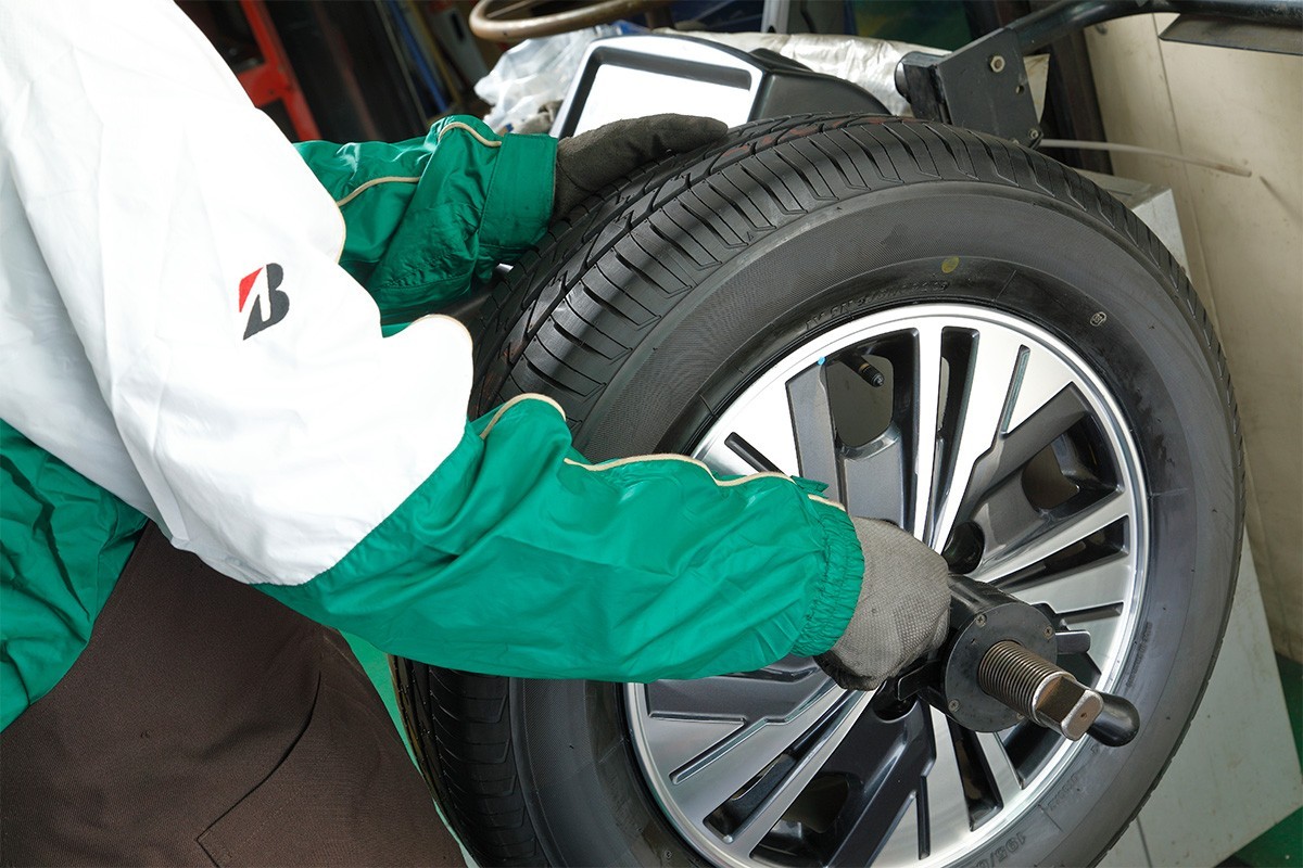 空気を充填したタイヤ・ホイールをホイールバランサーに取り付けて回転させることで計測し、バランスウェイトを取り付けることで適正な重心バランスに調整します。バランスがとれていないままタイヤ・ホイールを装着して走行すると、振動が発生しやすくなります。