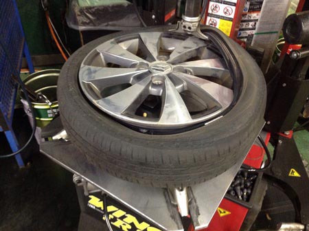 車両からタイヤを外して、タイヤチェンジャーにてタイヤを剥がします。
