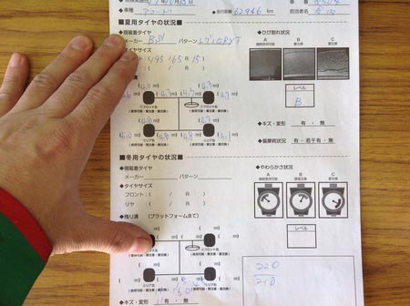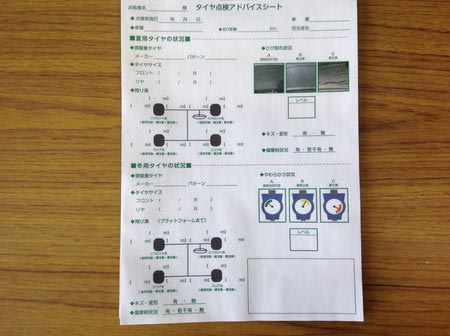 専用の点検シートにてタイヤの溝 年数 ヒビが無いかをプロの目で チェック致します。