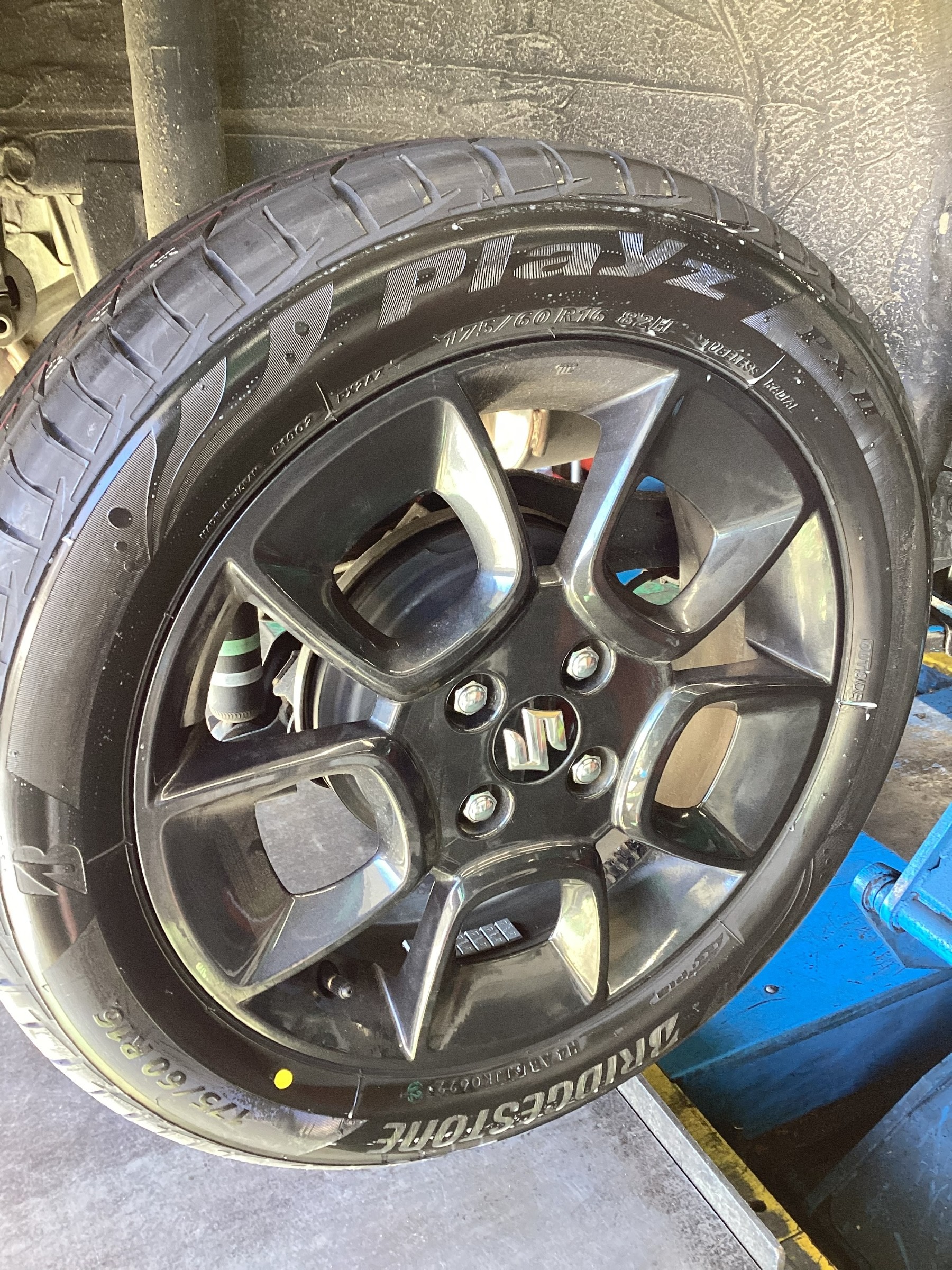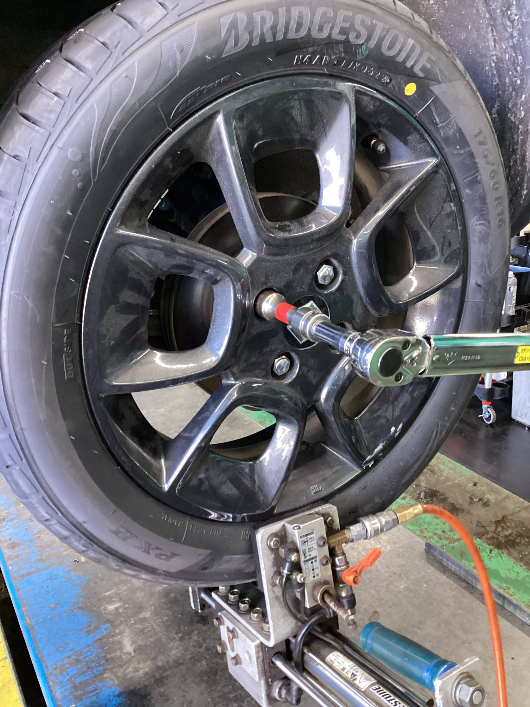 新品タイヤを装着する際、ブリヂストン専用の’センタリングマシン’をタイヤの下部に装着して既定のトルクで締め付けを行います(=゚ω゚)ノ