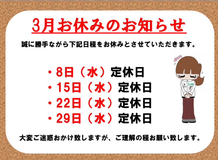 3月22日(水)は、定休日となります。