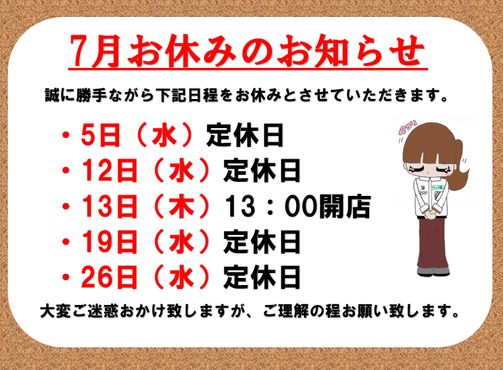 7月5日(水)・12日(水)・19日(水)・26日(水)は、定休日となります。