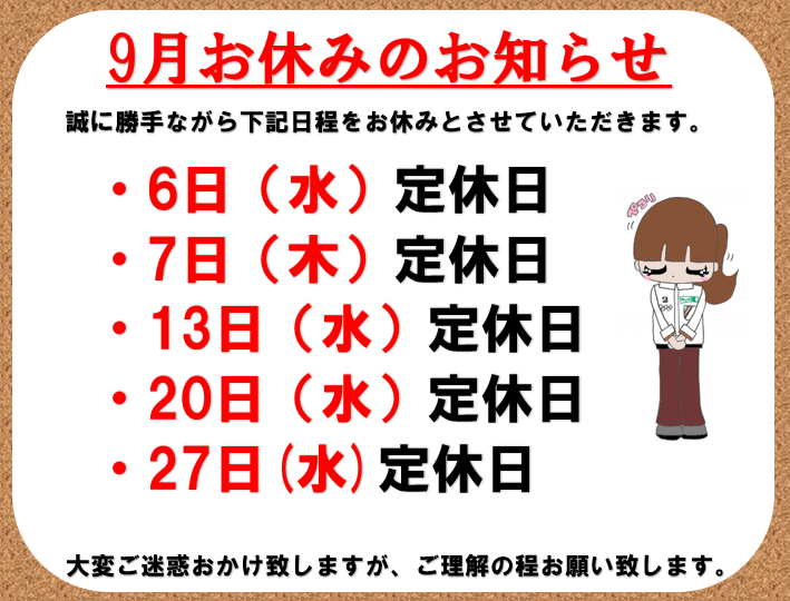 9月6日(水)・7日(木)・13日(水)・20日(水)・27日(水)