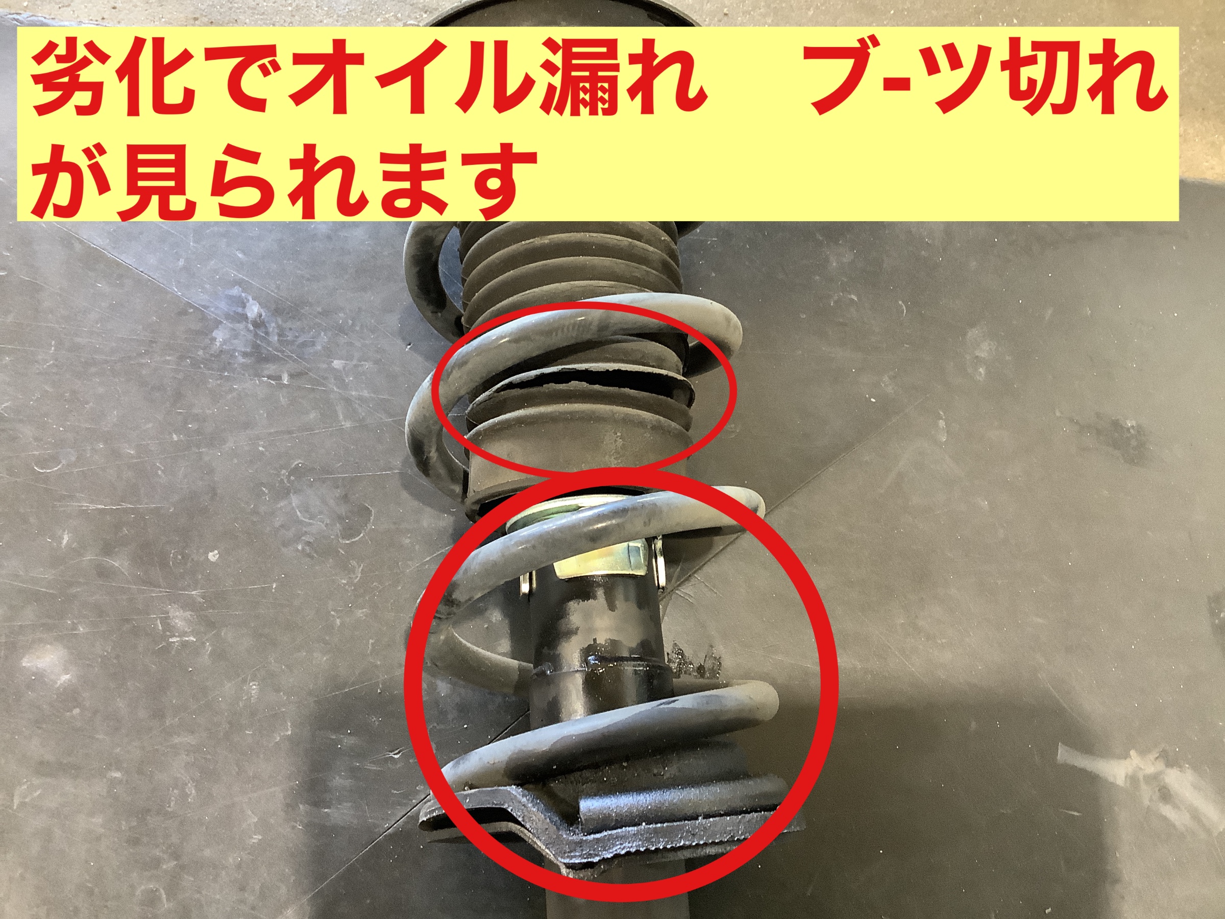 タイヤを外してみると、純正ショックからオイル漏れとブーツ切れが
