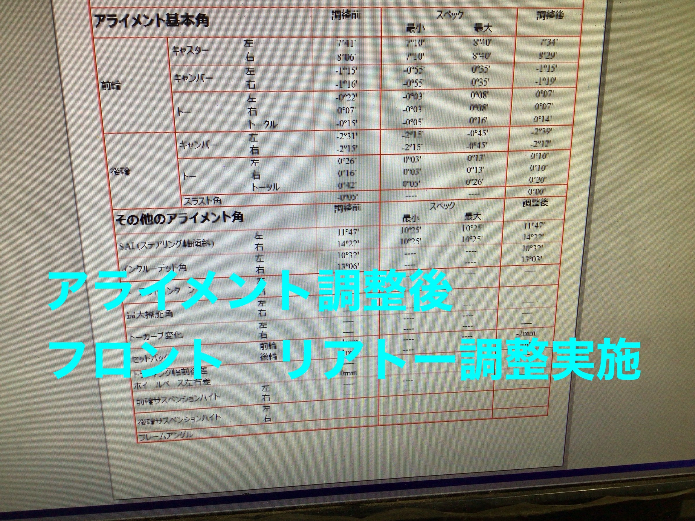 リアはキャンバーが2度以上ついたので基準値よりトーをインに向けました