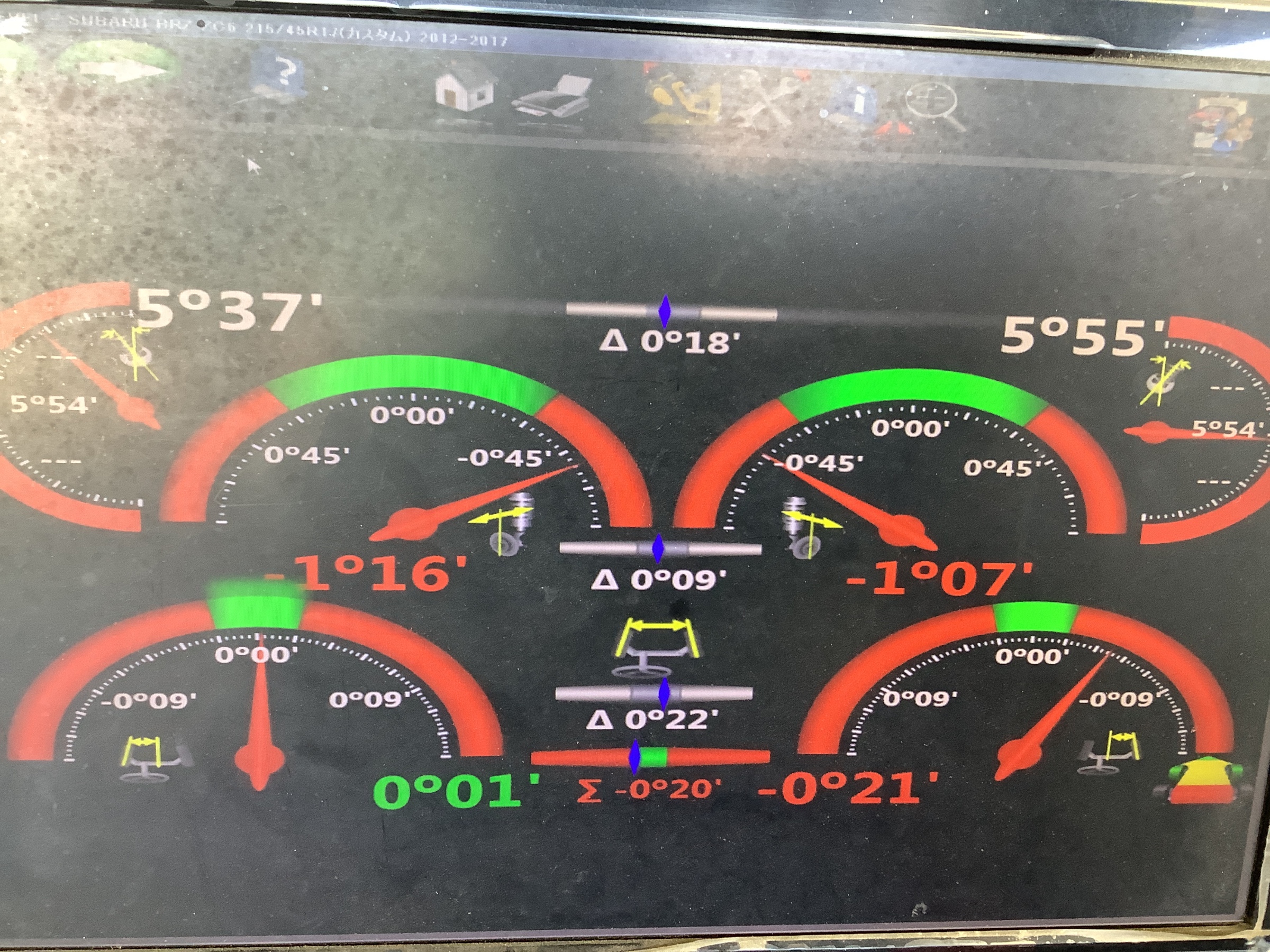 特にフロントタイヤのズレがはげしく、右タイヤが外方向(トーアウト)になっています。