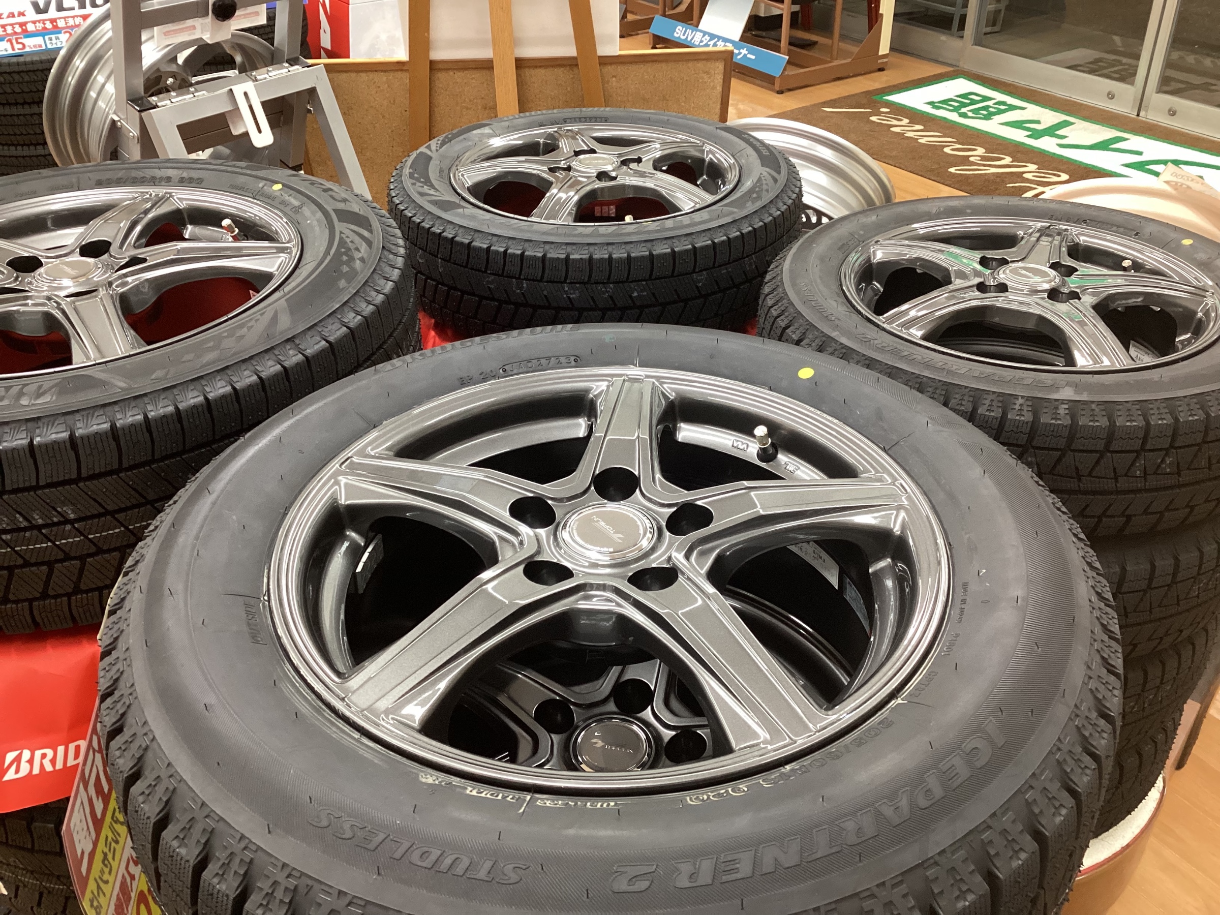 タイヤ館八千代ではすぐに取り付けられるスタッドレスタイヤとホイールの組込済みセット品をご用意しています!