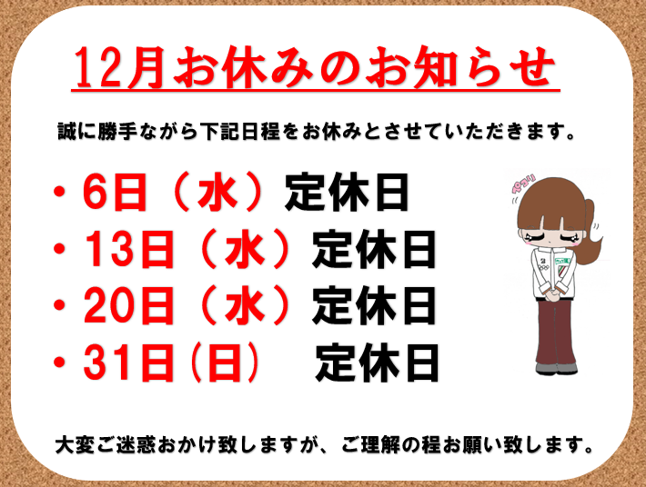 12月6日(水)・13日(水)・20日(水)・31日(日)