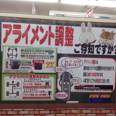 タイヤの角度調整、タイヤのアライメントがズレているとタイヤが偏摩耗して