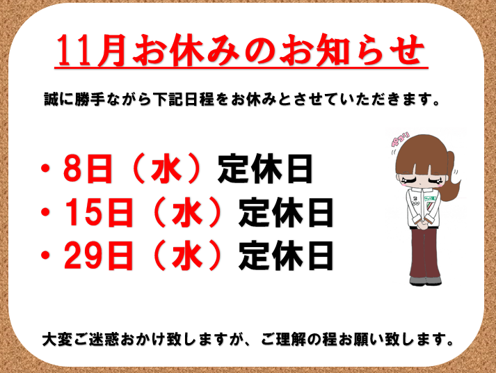 11月8日(水)・15日(水)・29日(水)は、定休日になります。