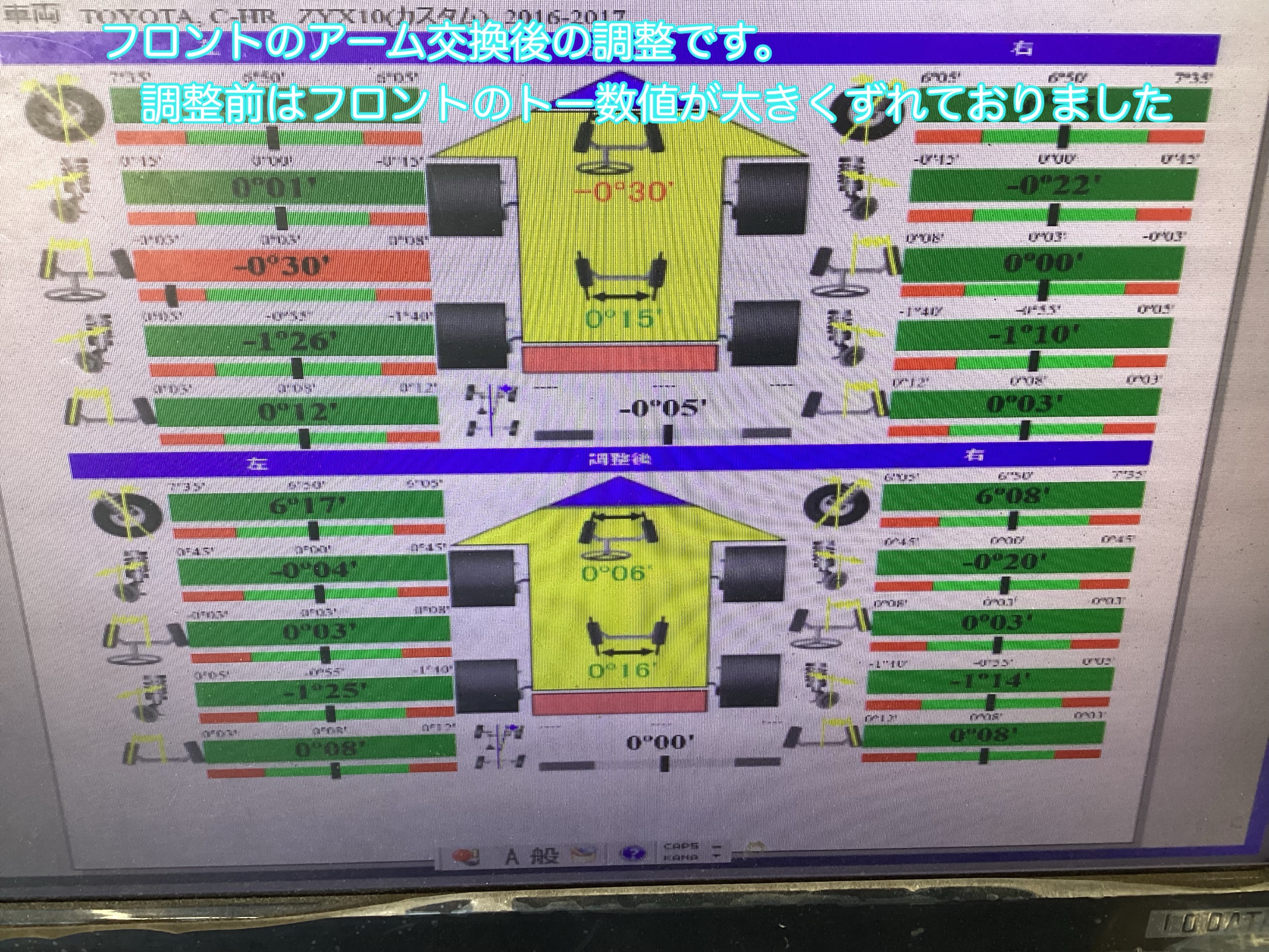 フロントロアアーム交換後の調整依頼にて来店 事故にて部品交換後測定してみたら