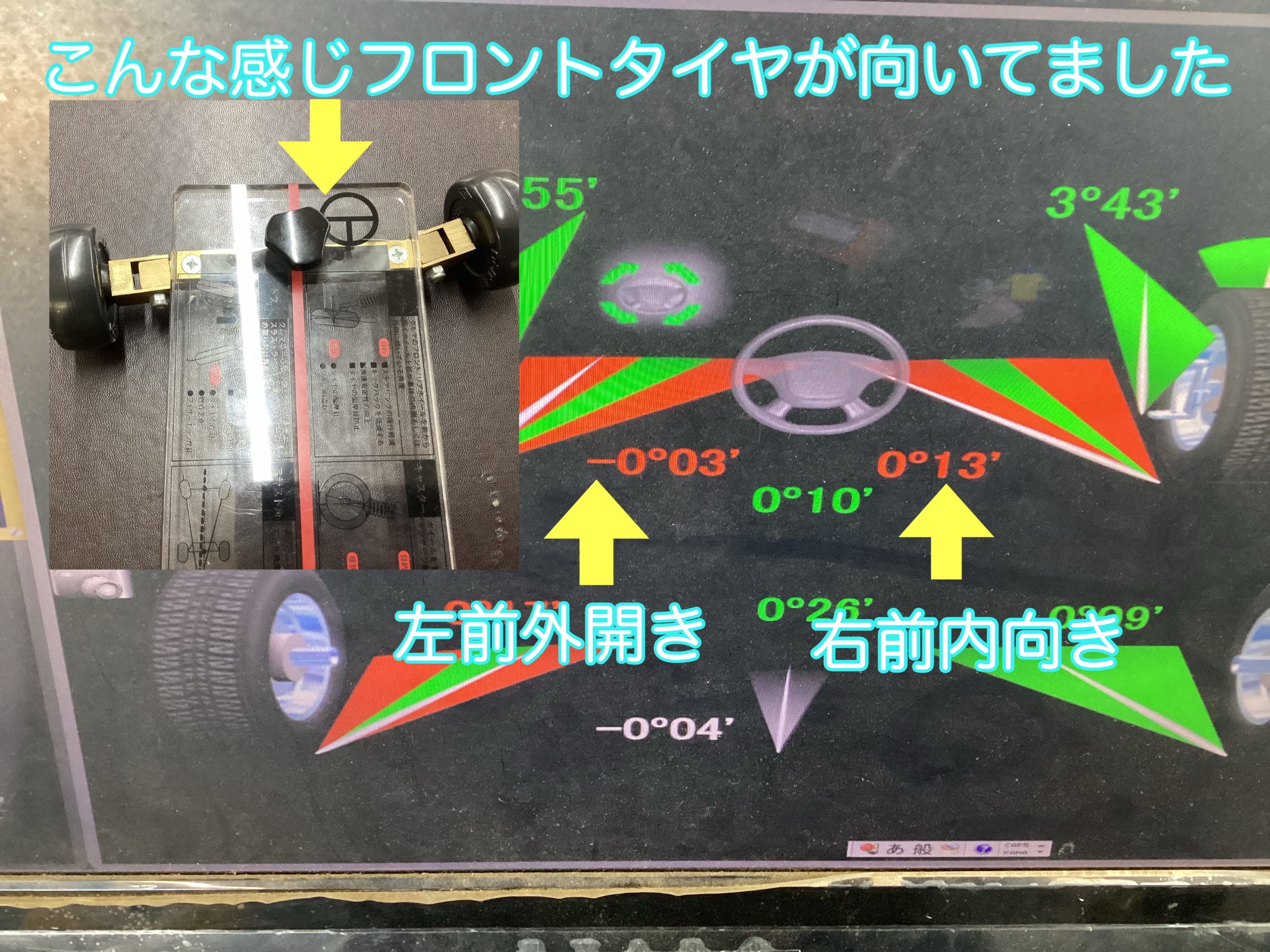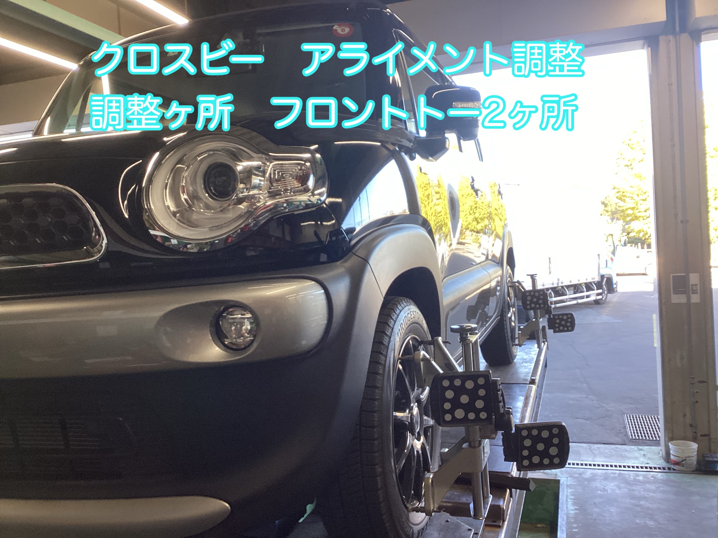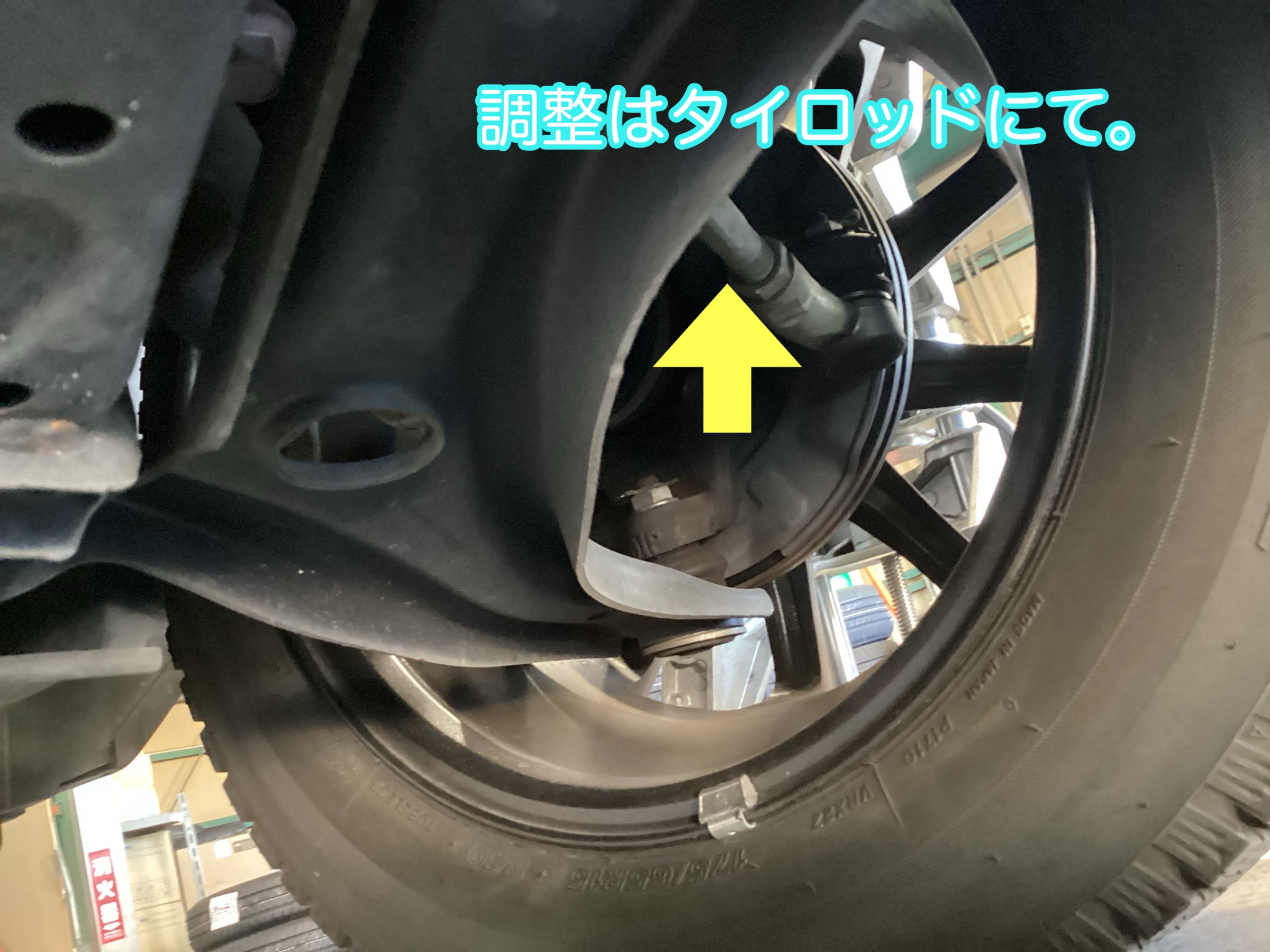 フロントのタイロッドにて基準値合わせて調整し作業終了となります。