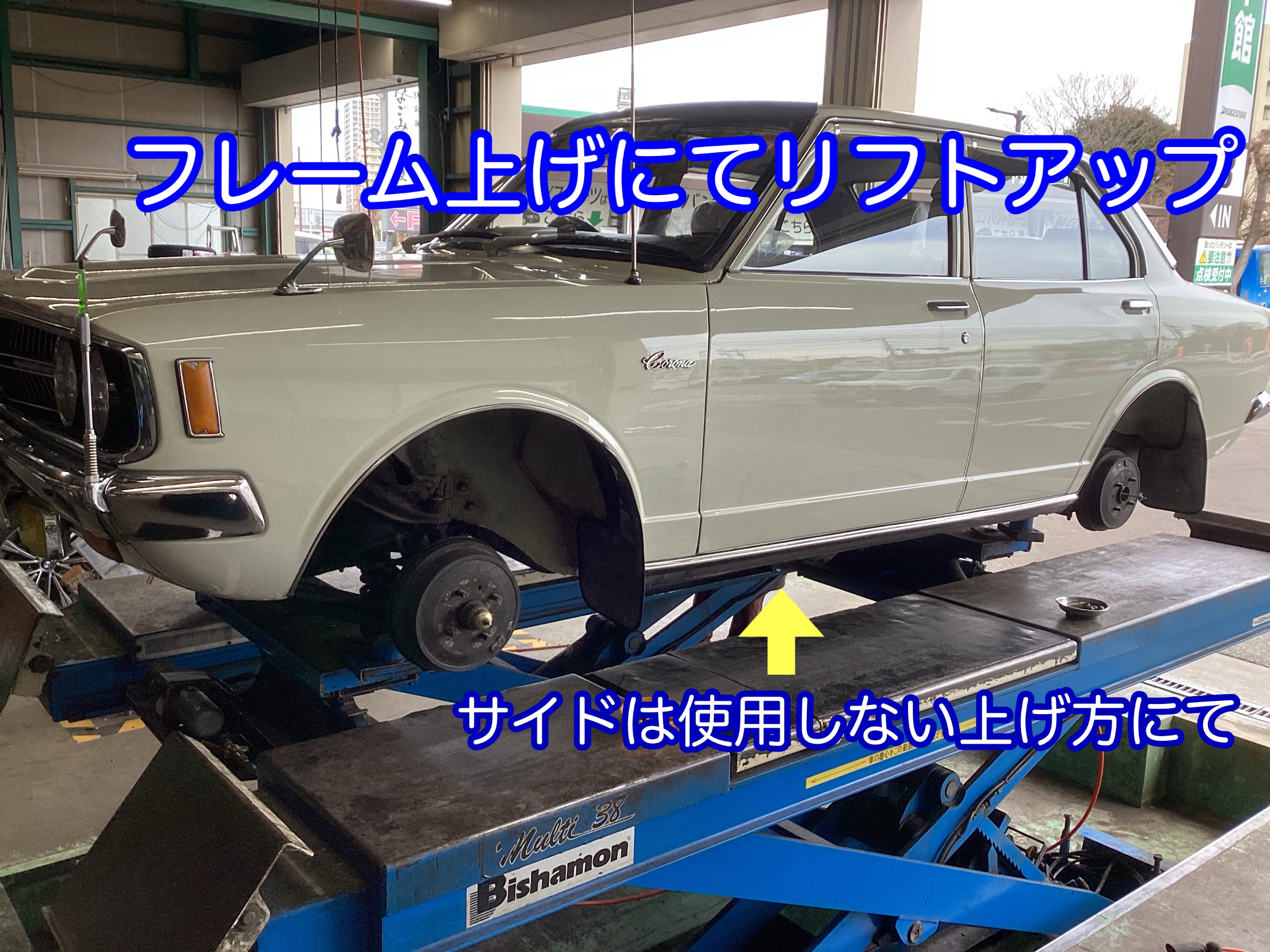 当店のリフトはサイド上げしない上げ方も対応しております。旧車のボディー痛めないように