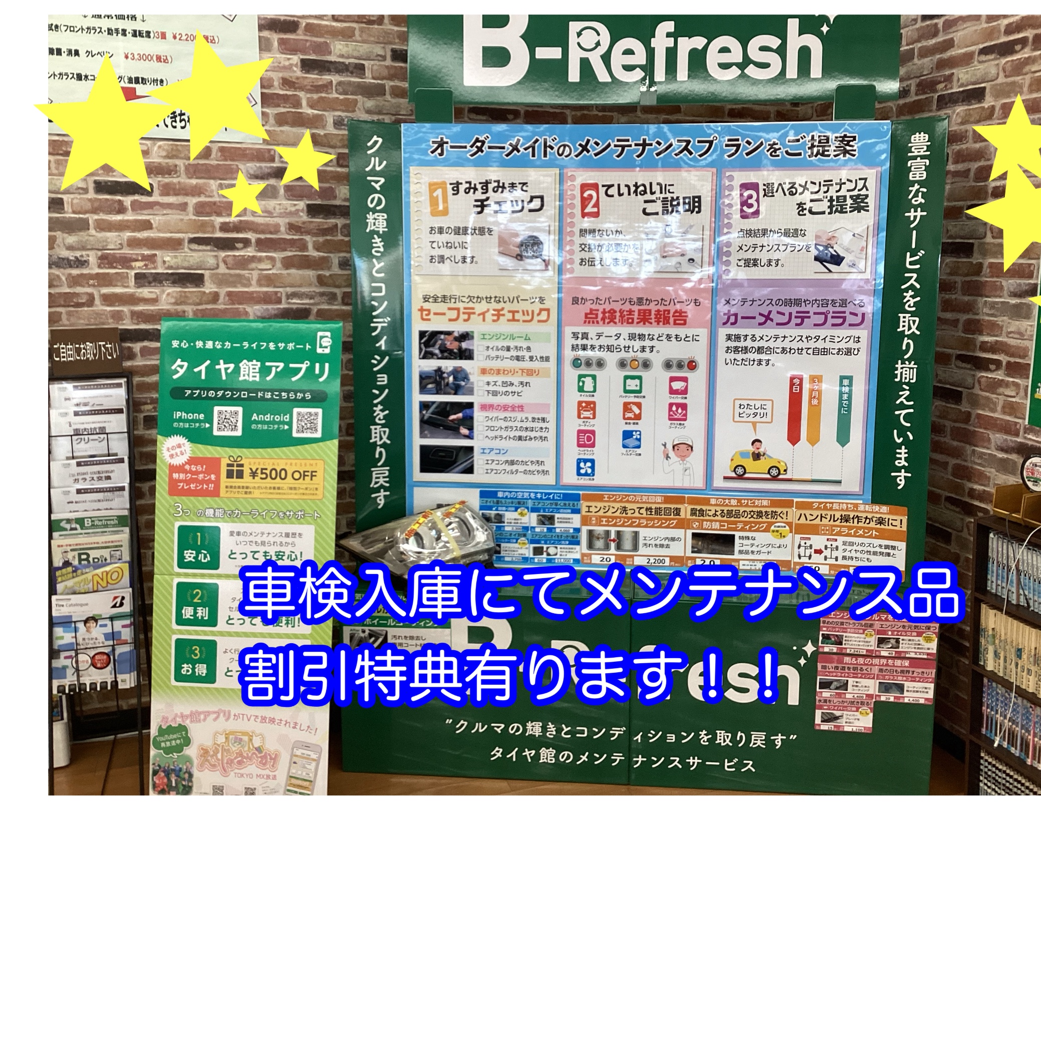 車検と同時にメンテナンス品交換実施にて割引サービス特典ご用意しております。